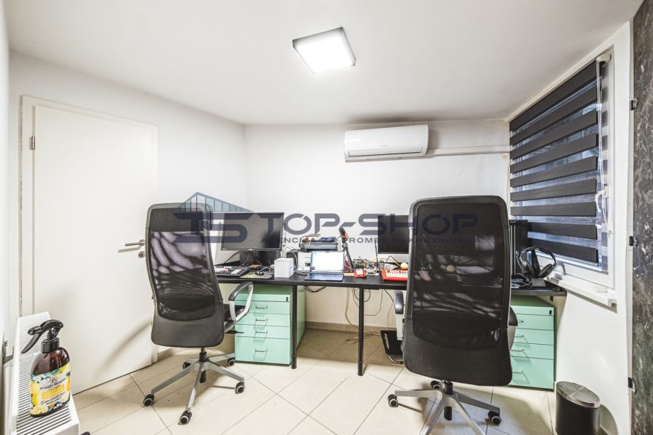 U prizemlju kuće nalaze se s lijeve strane kupaonica i dvije prostrane spavaće sobe (od kojih veća ima i walk-in ormar) a s druge strane je roditeljska soba povezana s uredom i još jednom kupaonicom. Ured posjeduje i odvojen vanjski ulaz tako da ga je moguće koristiti i neovisno o ostatku kuće.