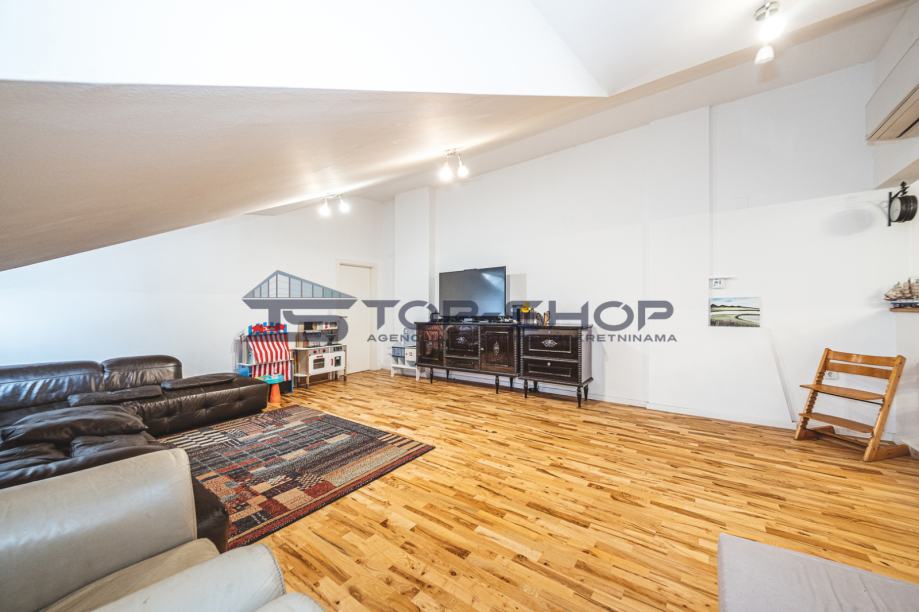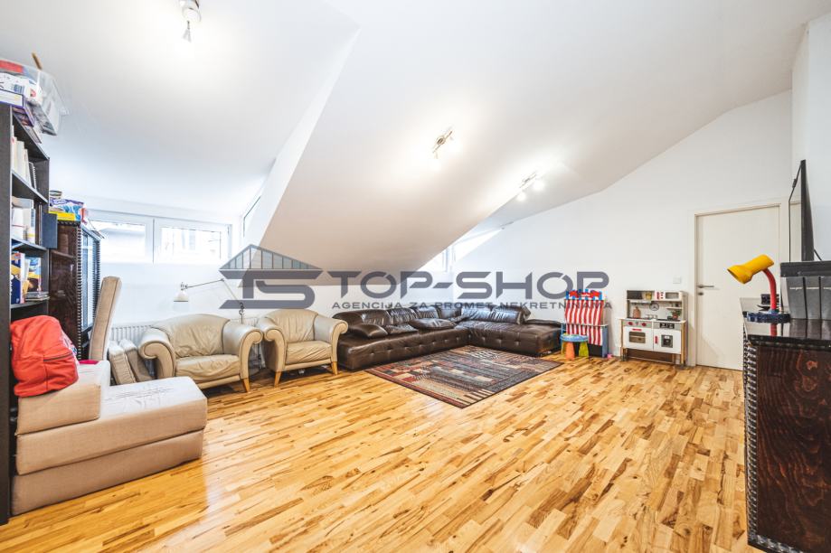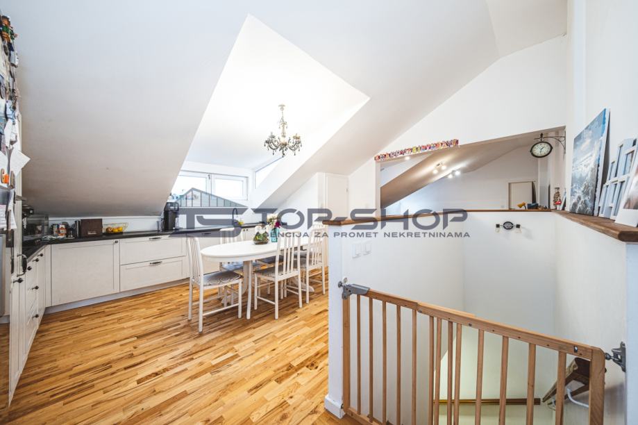 Kroz glavni ulaz vaši gosti ulaze u hodnik u kojem mogu ostaviti kapute i cipele te se hrastovim stubištem penju na gornju etažu, bez potrebe prolaska kroz ostale sobe. Dočekuje ih prostrani otvoreni prostor koji se prilagođava svim vašim potrebama - zajedničko kuhanje u novoj kuhinji izrađenoj po mjeri, svečani objed za obiteljskim stolom, opuštanje uz dobru knjigu, filmska večer uz izležavanje na garnituri koja može primiti cijelo društvo ili pak pravi mali plesnjak uz pravu glazbu i bez brige smetate li susjede ispod vas. I kao poseban užitak, kava uz sunce i cvrkut ptica na terasi koja kao da nije u istome gradu.