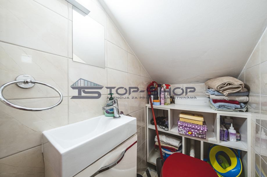 Budući ćete većinu vremena provoditi na gornjoj etaži, na njoj se nalaze još i gostinjski WC te dječja soba kako bi vam mališani bili uvijek na oku. U dječjoj sobi nalazi se i ugradbena ostava (galerija) velike zapremine koja će s lakoćom progutati svu zimsku robu, rezervnu posteljinu, opremu za more i sve ostalo što ne želite gledati izvan sezone.