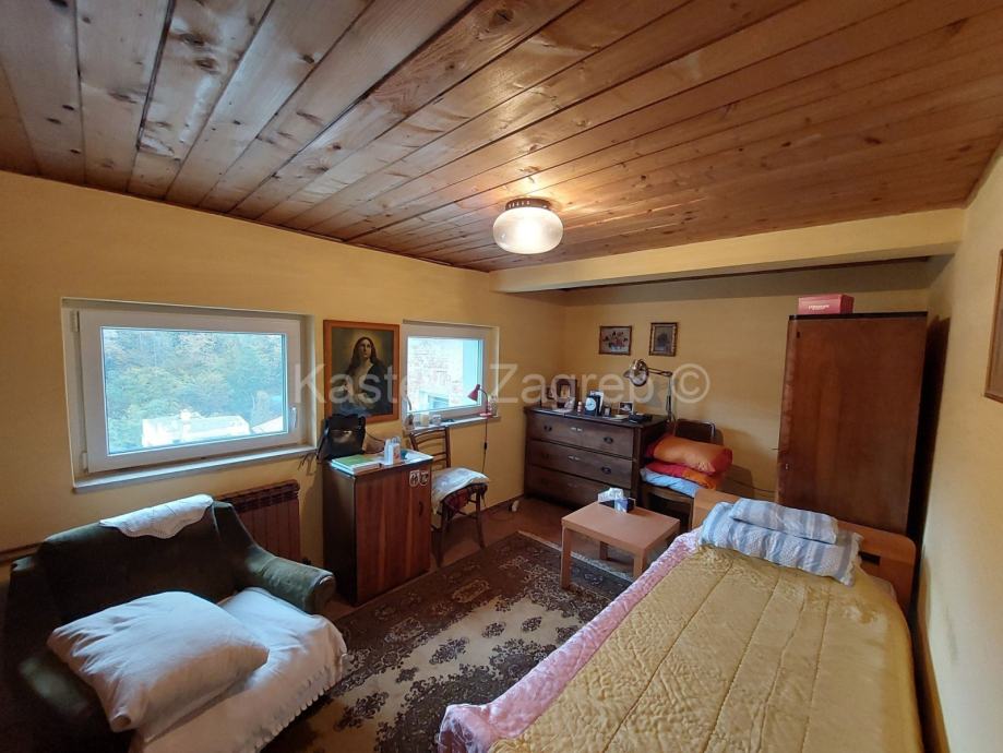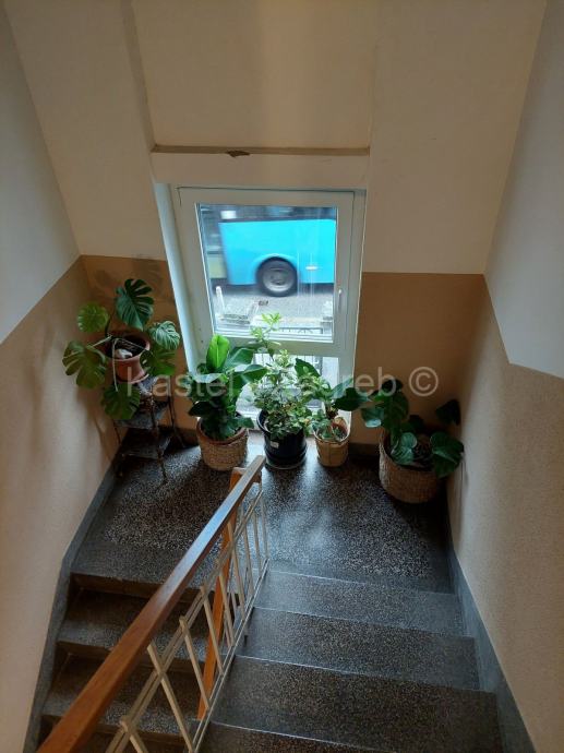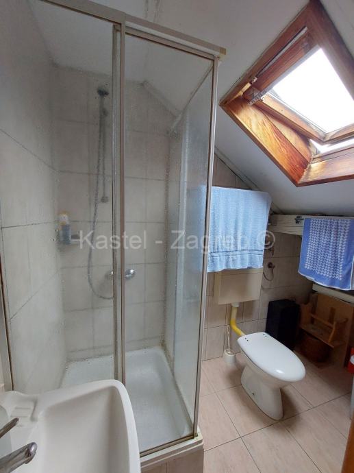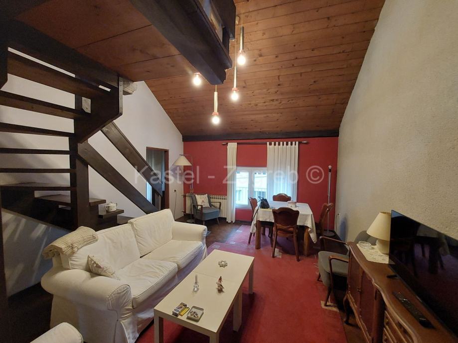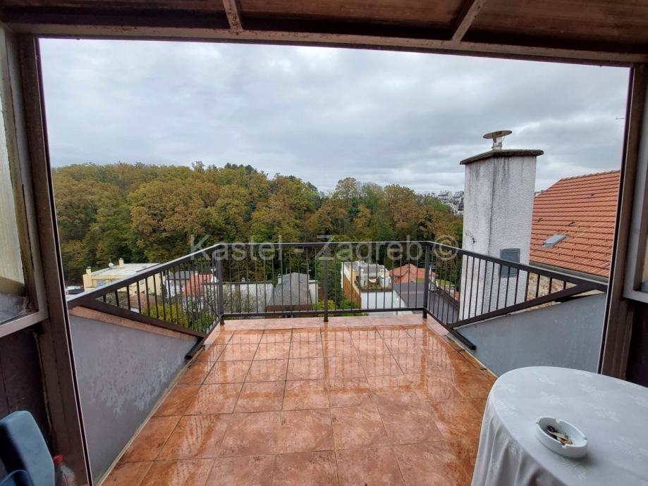 Gornju etaža stana čine soba 20 m2,manja sobica 5 m2, galerija 10 m2 s pogledom na boravak donje etaže, kupaona i terasa 8,48 m2 s prekrasnim pogledom na Park šumu Jelenovac i Pantovčak.