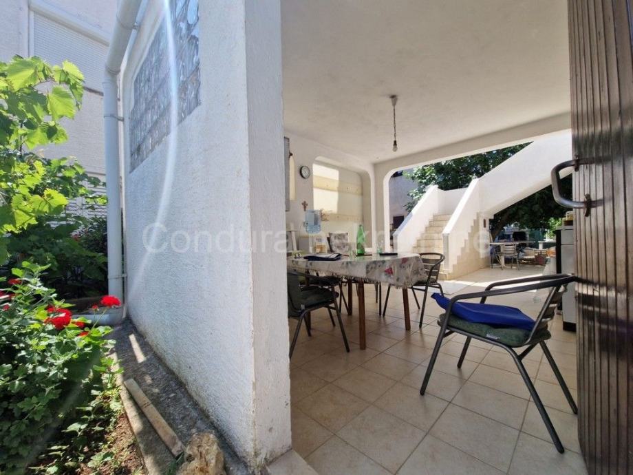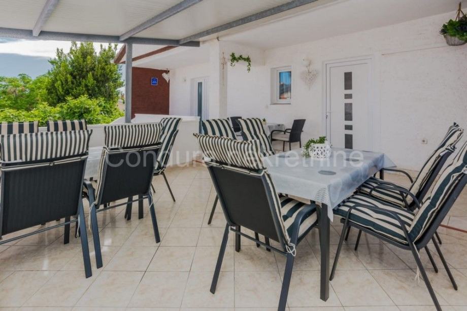Velika terasa s direktnim pristupom dvorištu pruža savršen prostor povezan s uređenim vrtom s mediteranskim biljem. Dvorište je dovoljno veliko za izgradnju bazena, a dostupno je i veliko parkiralište za više vozila.
