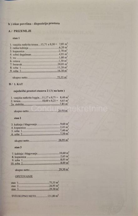 Prizemlje obuhvaća prostrani apartman s tri spavaće sobe, kuhinju s blagovaonicom, dnevni boravak, kupaonicu, toalet te ostavu.