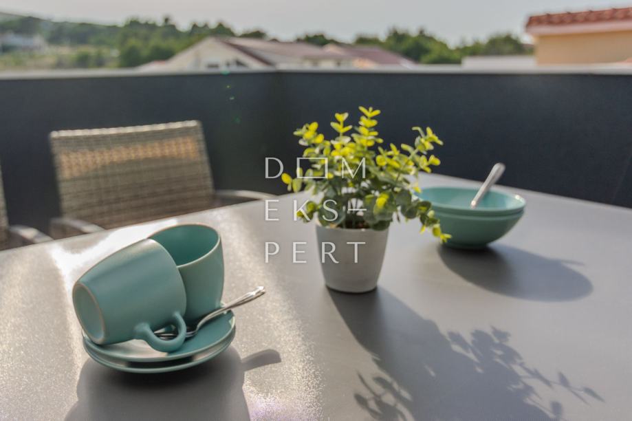 Pripadaju mu velika uređena krovna terasa sa koje se priža divan pogled na more, a na koju se ide iz stubišta zgrade i vanjsko nenatkriveno parkirališno mjesto.