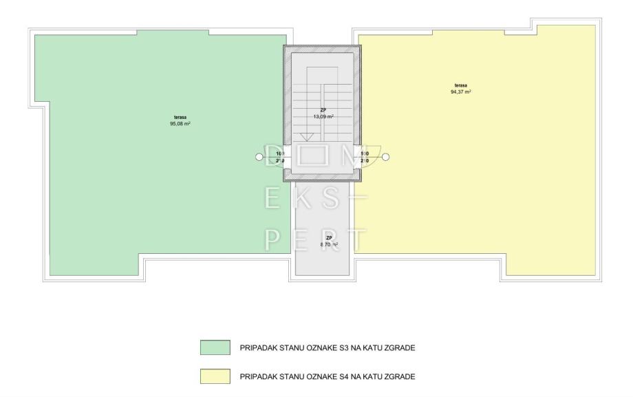 Svi pripatci se obračunavaju po zakonskim koeficijentima, a neto korisna površina stana sa svim pripatcima iznosi 108,86 m2.