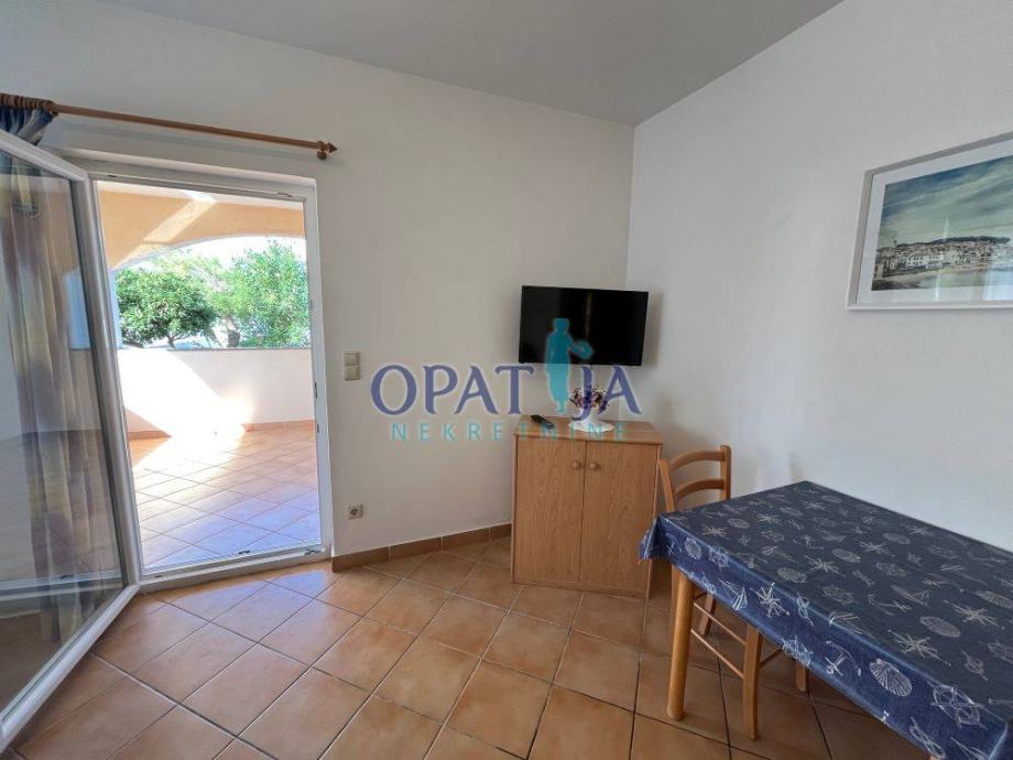 Stan je veličine 54 m² i sastoji se od hodnika, wc-a, 1 spavaće sobe, kupaonice, kuhinje i dnevnog boravka s izlazom na lođu s pogledom na more. Postoji klima uređaj za grijanje i hlađenje, u kratkom zimskom periodu može se priključiti kamin. Za kuhanje su dostupni plin i struja. Prodaje se namještena.