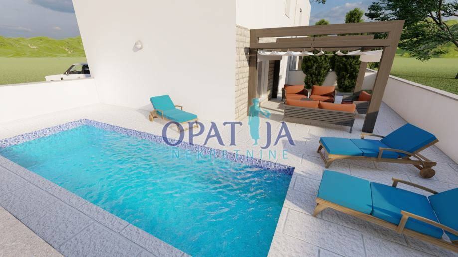 Kuća se sastoji od 2 etaže plus krovna terasa i vrt s bazenom. Sastoji se od 2 etaže plus krovna terasa i vrt s bazenom. Nalazi se na parceli od 276m² sa netto stambenom površinom od 108m²