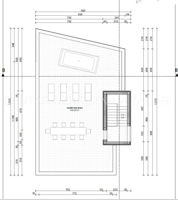 Apartmanu u prizemlju pripada 140 m2 vrta, dok apartman na drugom katu ima nenatkrivenu krovnu terasu od 103,30 m² (neto 25,83 m2).