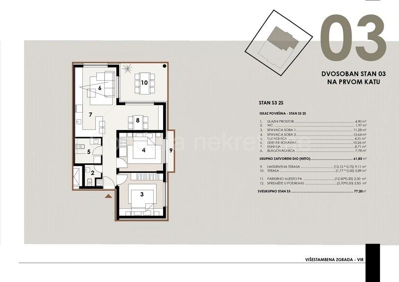 Ukupna neto korisna površina apartmana sa svim pripatcima iznosi 77,20 m², a sastoji se od: