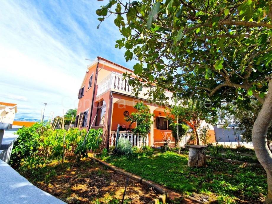 Prvi kat kuće odvojen je vanjskim stubištem te posjeduje dvije velike terase s pogledom na more i planinu Velebit.