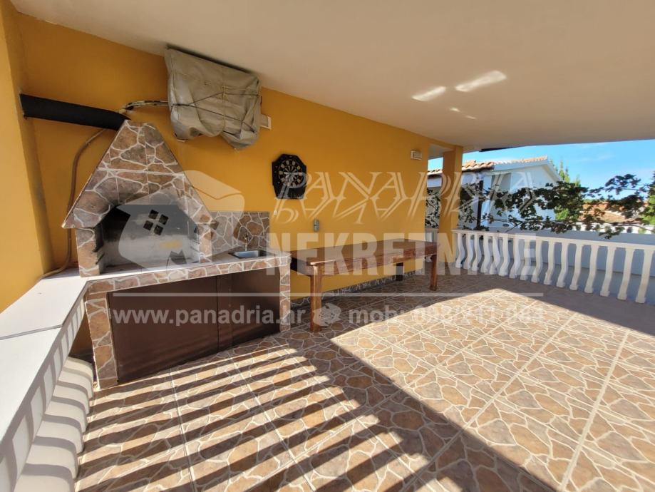 Vanjske stepenice vode na prvi na kat: velika terasa s roštiljem i prostorom za druženje, hodnik, kuhinja s dnevnim boravkom, soba, kupaonica,iz dnevnog boravka, ostavljen je dio za unutarnje stepenice za potkrovlje, koje nije uređeno.