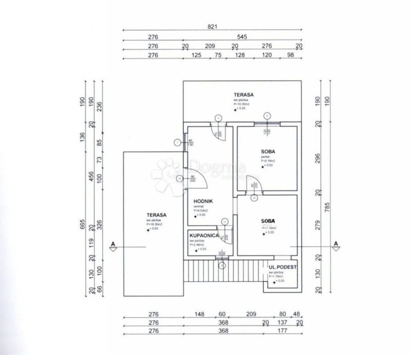 Stambeni prostor površine oko 62 m² sastoji se od ulaznog stubišta, dnevnog boravka s kuhinjom i blagovaonicom, dvije spavaće sobe te kupaonice. Poseban dojam ostavljaju dvije prostrane terase – jedna s pogledom na more, druga orijentirana prema dvorištu i suncu tijekom cijelog dana.