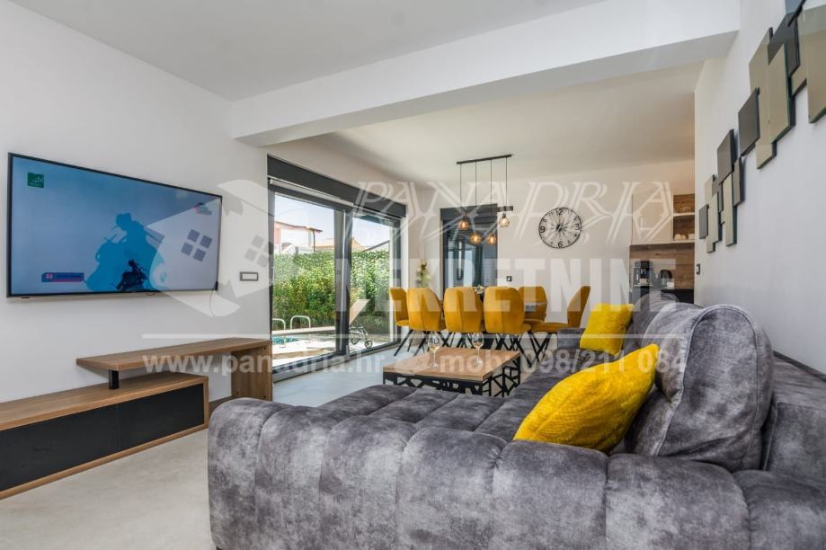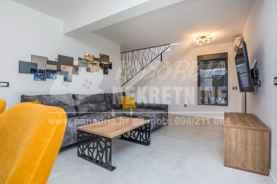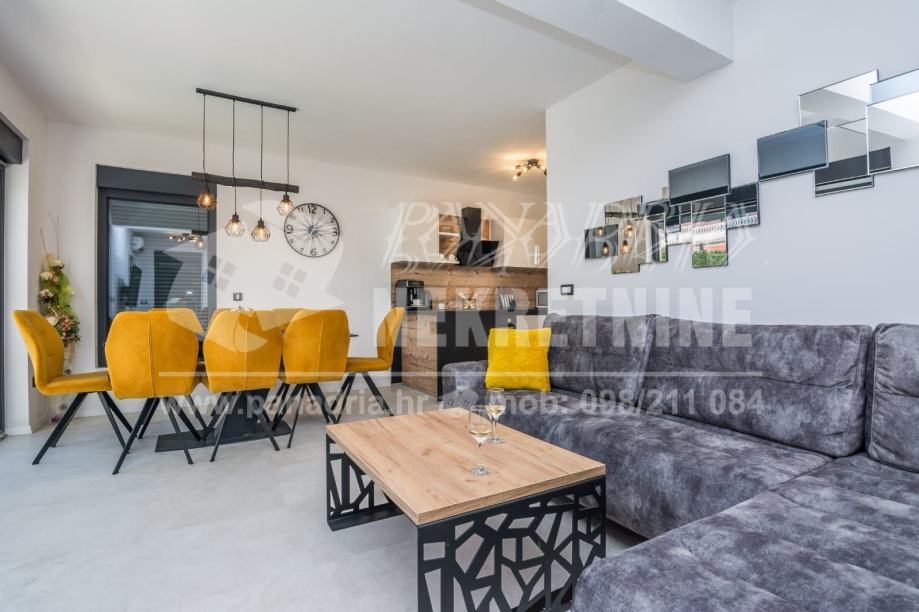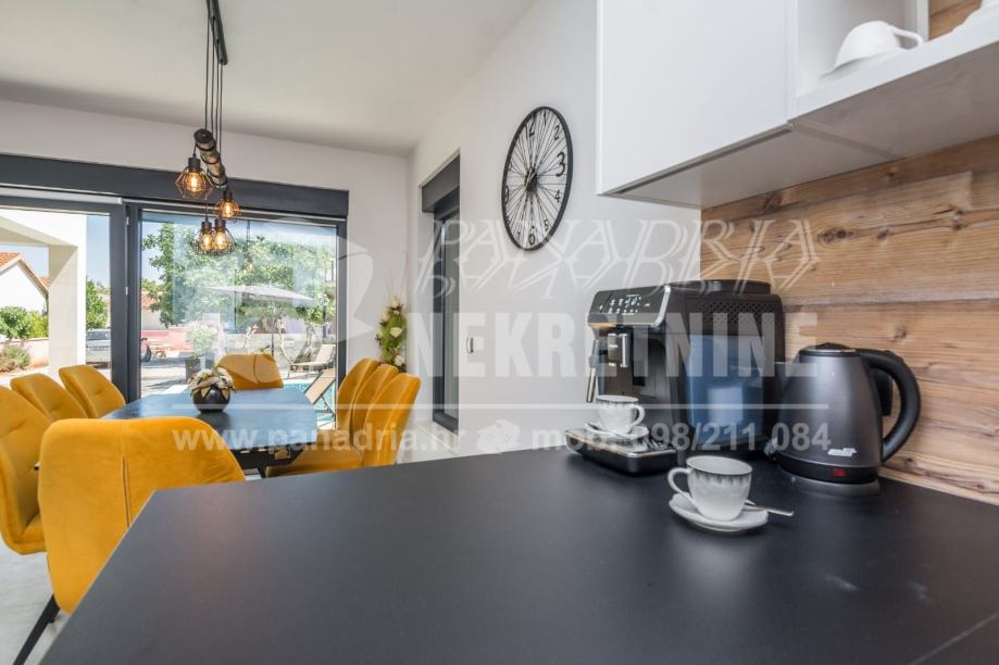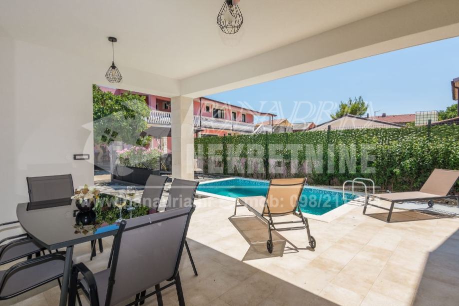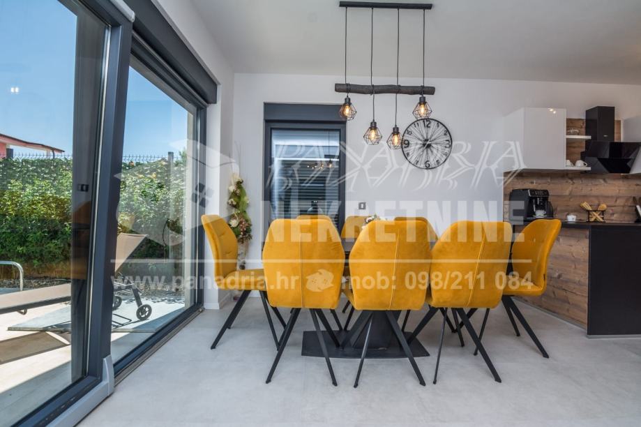 U prizemlju se nalazi kupaonica, ostava te prostrani dnevni boravak s kuhinjom i blagovaonicom i natkrivene terase s uređenom okućnicom i bazenom, unutarnje stepenice vode na kat na kojem se nalaze tri spavaće sobe i još jedna kupaonica.