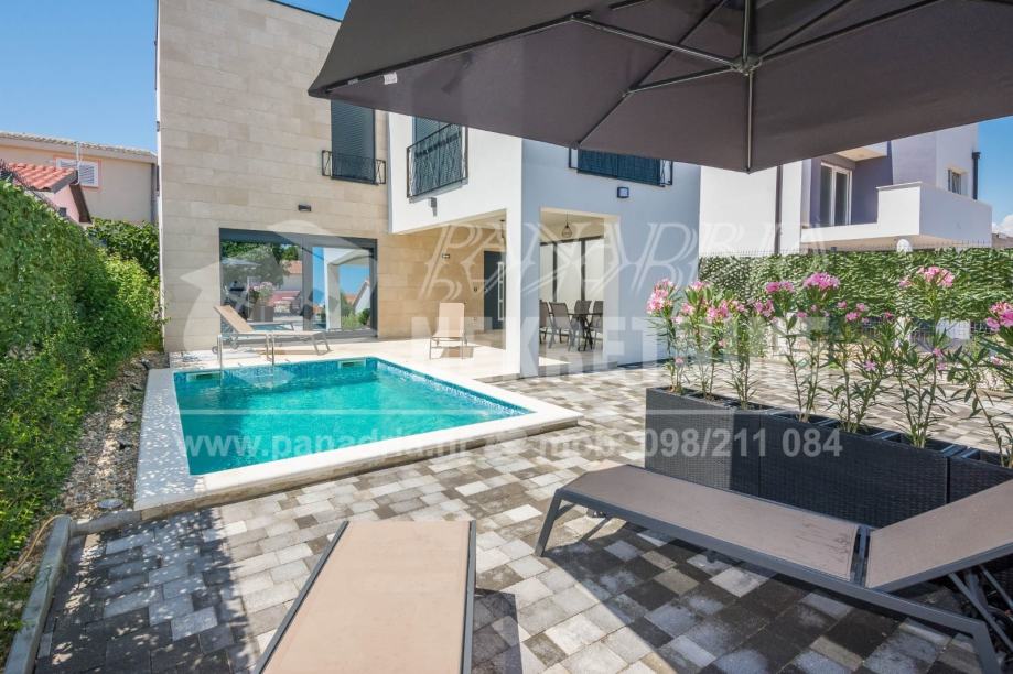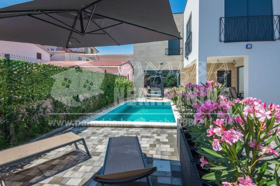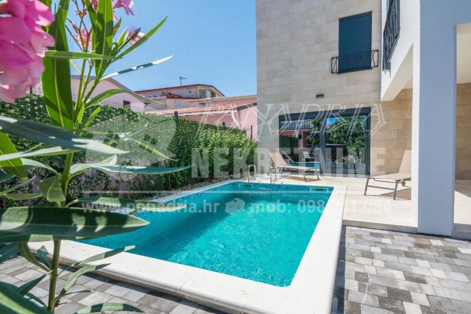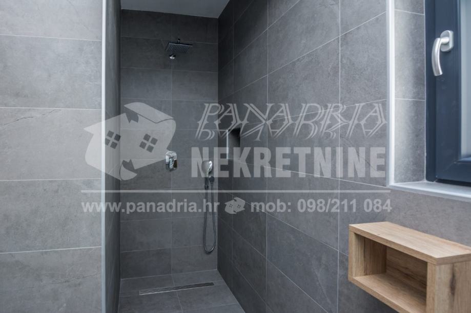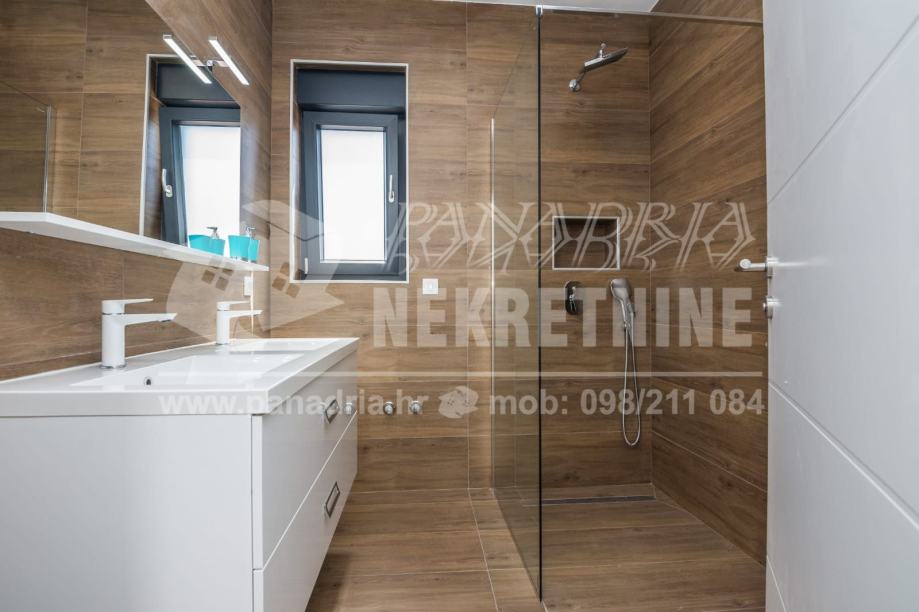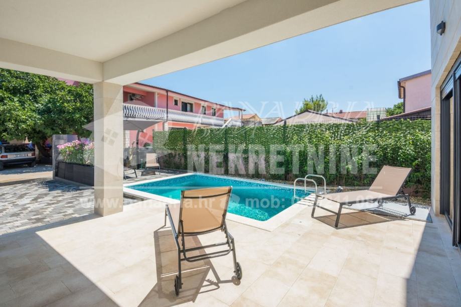 U prizemlju se nalazi kupaonica, ostava te prostrani dnevni boravak s kuhinjom i blagovaonicom i natkrivene terase s uređenom okućnicom i bazenom, unutarnje stepenice vode na kat na kojem se nalaze tri spavaće sobe i još jedna kupaonica.