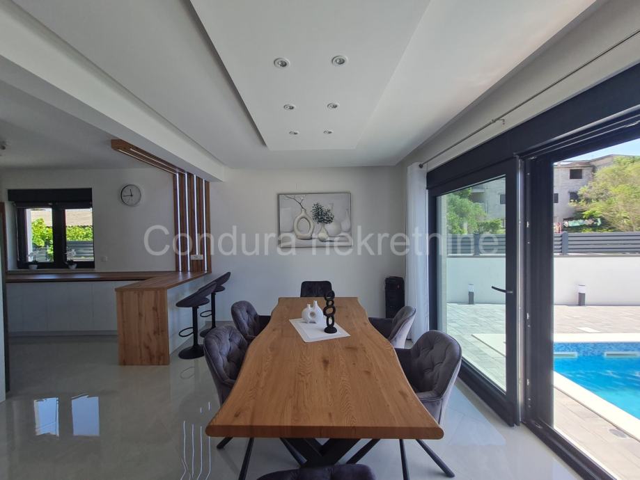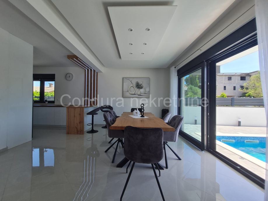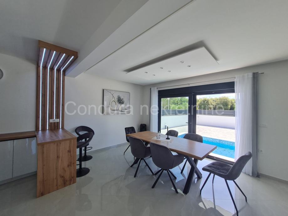 Sastoji se od prizemlja i kata. U prizemlju se nalaze ulazni prostor, spremište, praonica, WC te kuhinja s blagovaonicom i dnevnim boravkom iz kojih se izlazi na natkrivenu terasu s pogledom na bazen. Unutarnjim stubištem se ide na gornji kat na kojem se nalaze tri spavaće sobe, svaka s vlastitom kupaonicom, a dvije imaju i izlaz na djelomično natkrivenu terasu.