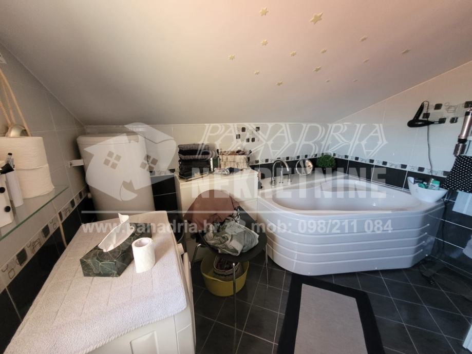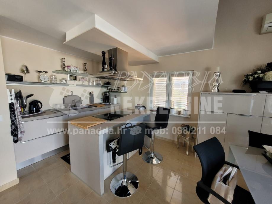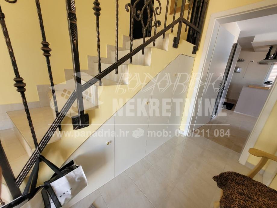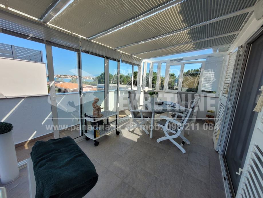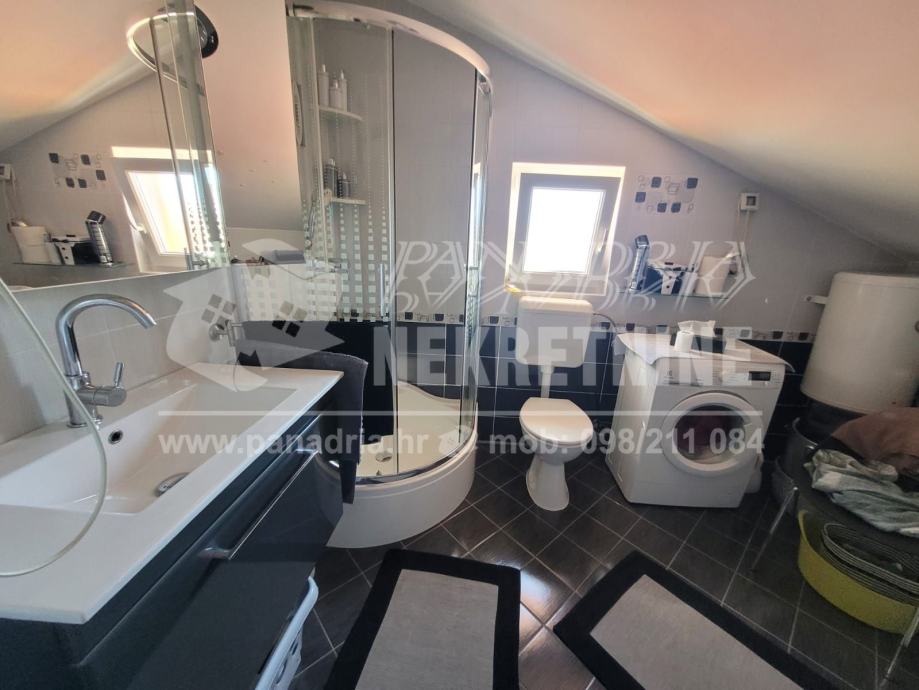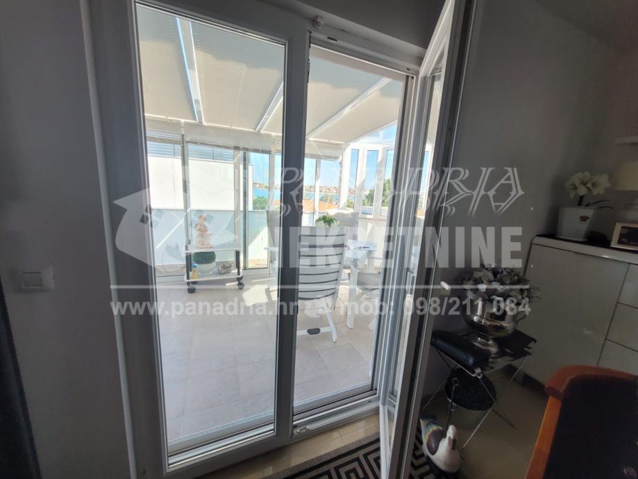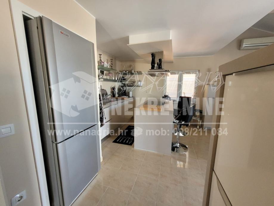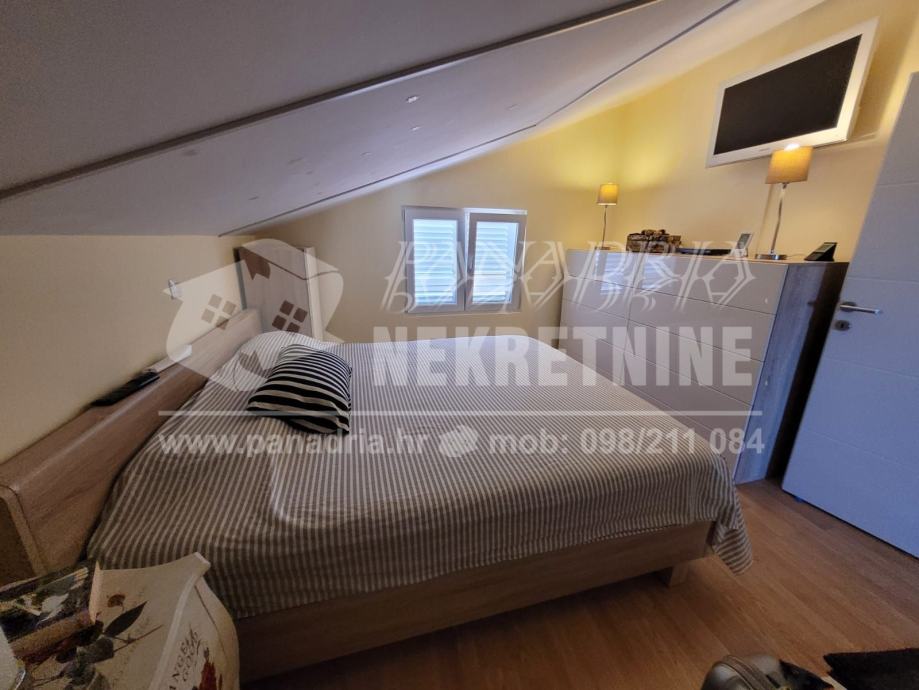 Apartman je površine 102,75 m2, na drugom katu se nalazi kuhinja, blagovaonica, dnevni boravak,balkon s pogledom na more, wc i prostrana terasa od koje je dio zatvoren u staklo, s terase se pruža prekrasan pogled na more i okolicu, unutarnje stepenice vode u potkrovlje gdje se nalazi jedna spavaća soba velika kupaonica s tuš kabinom i kadom te velika soba koja je uređena kao garderoba.