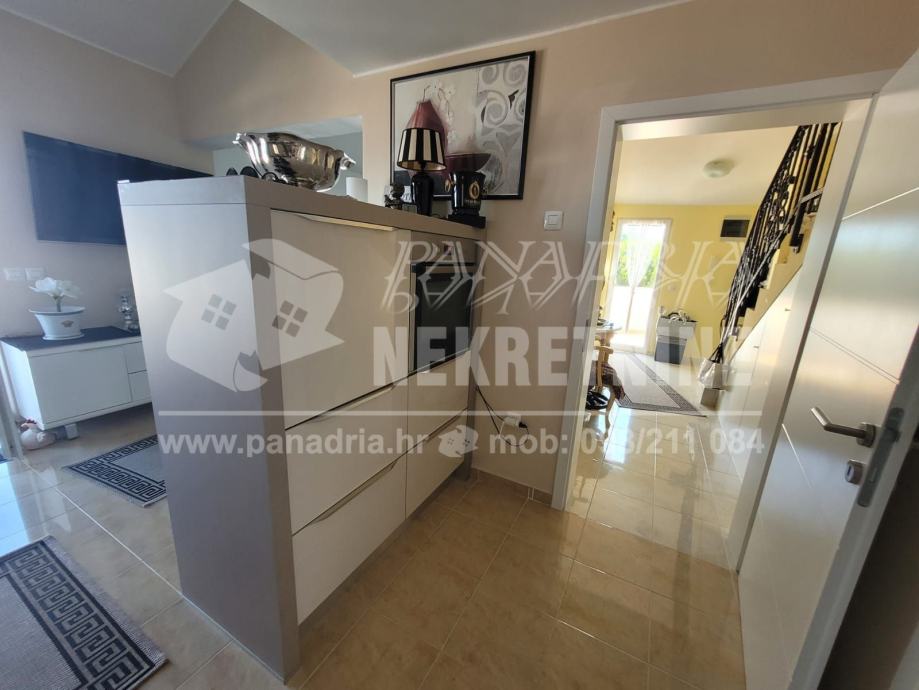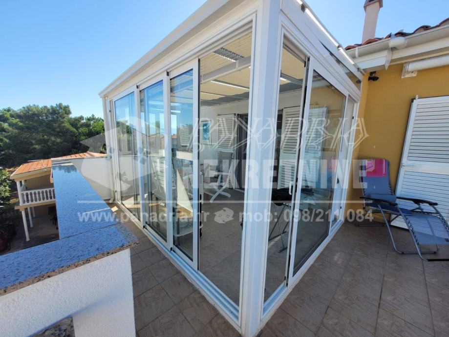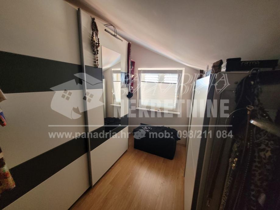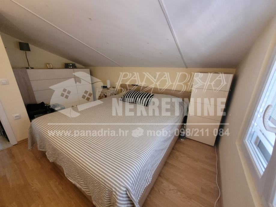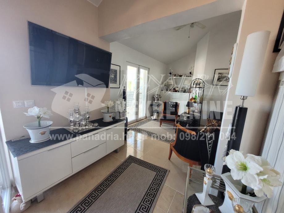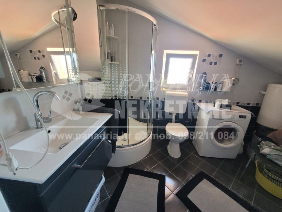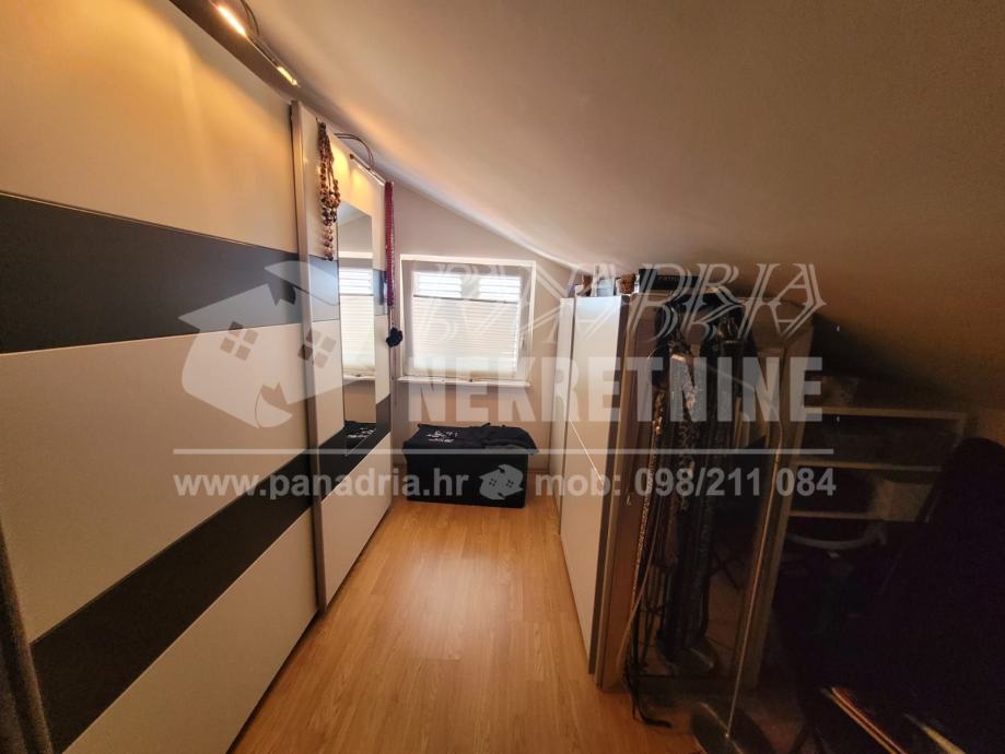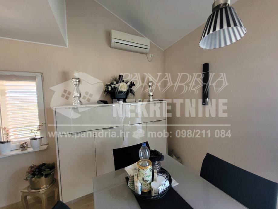 Apartman je površine 102,75 m2, na drugom katu se nalazi kuhinja, blagovaonica, dnevni boravak,balkon s pogledom na more, wc i prostrana terasa od koje je dio zatvoren u staklo, s terase se pruža prekrasan pogled na more i okolicu, unutarnje stepenice vode u potkrovlje gdje se nalazi jedna spavaća soba velika kupaonica s tuš kabinom i kadom te velika soba koja je uređena kao garderoba.
