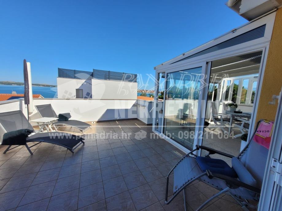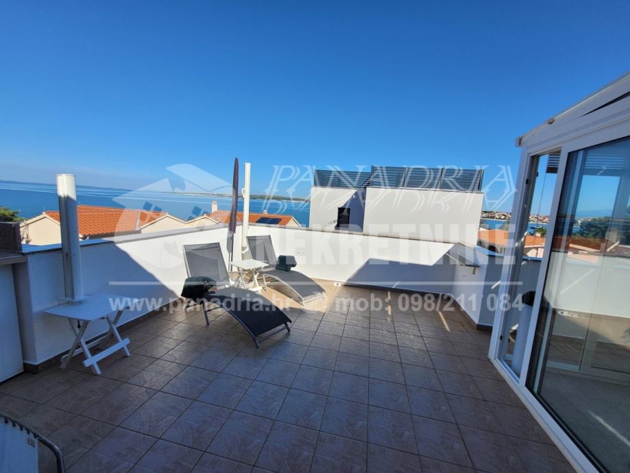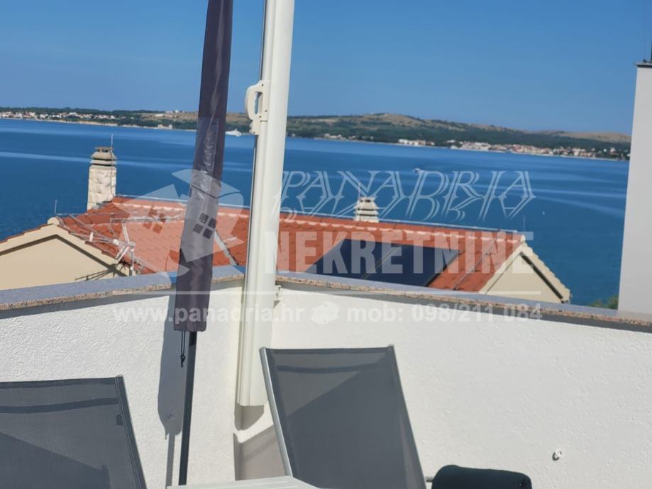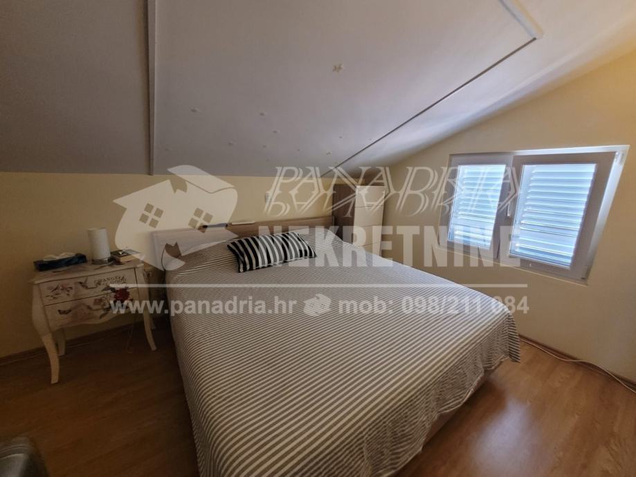 Apartman se nalazi na drugom katu i potkrovlju stambene zgrade udaljen od mora 60 metara s prekrasnim pogledom na more i otoke.