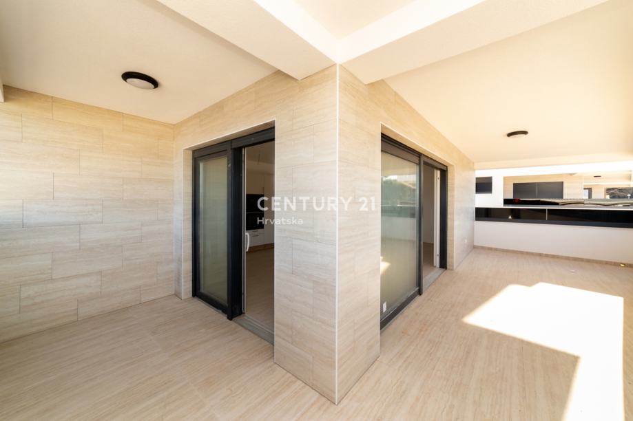 Sastoji se od prostranog dnevnog boravka sa kuhinjom i blagovaonicom ( 36,46 m2), 2 odvojene spavaće sobe svaka ( 11,04 m2+11,05) m2, s time da jedna spavaća soba ima vlastitu kupaonicu, druga kupaonica, spremište, te prostrana natkrivena terasa površine 22,62 m2 ( neto za izračun 11,31 m2). Svakome stanu pripadaju 2 etažirana parkirna mjesta, te ovome stanu dodatno pripada i dvorište korisne površine 145,02 m2.