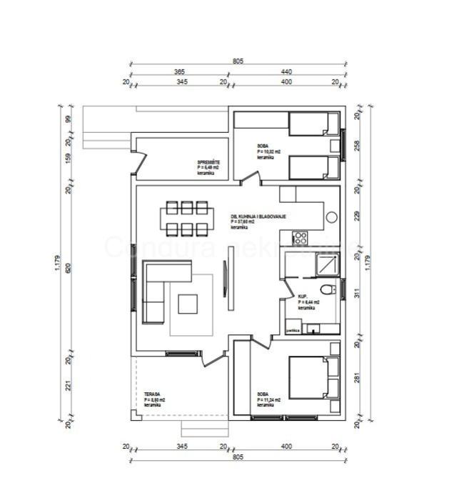 Samostojeća kuća, prizemnica, koja se sastoji od 3 spavaće sobe, kuhinje s blagavaonom, dnevnog boravka, 2 kupaone i velike terase.