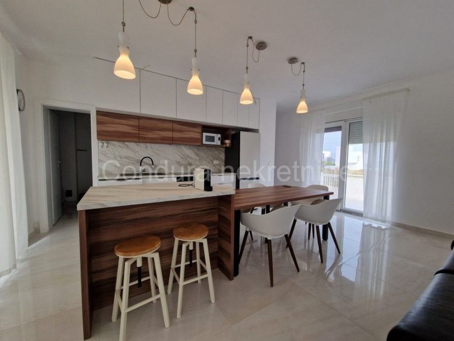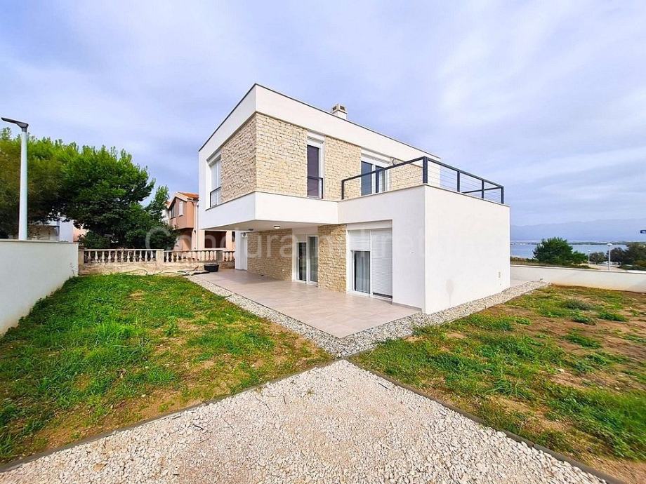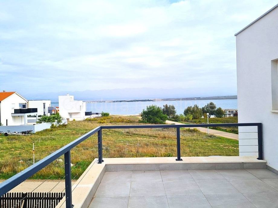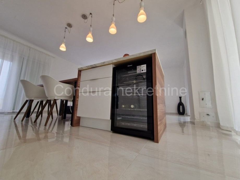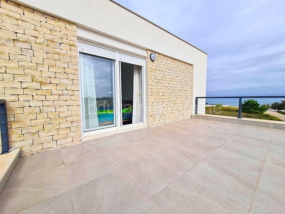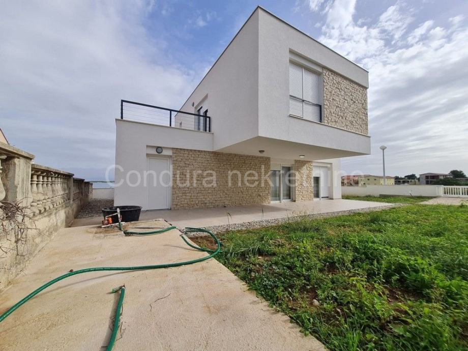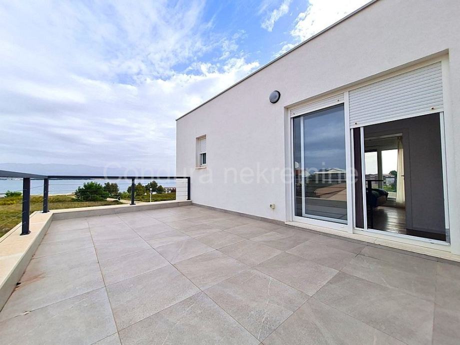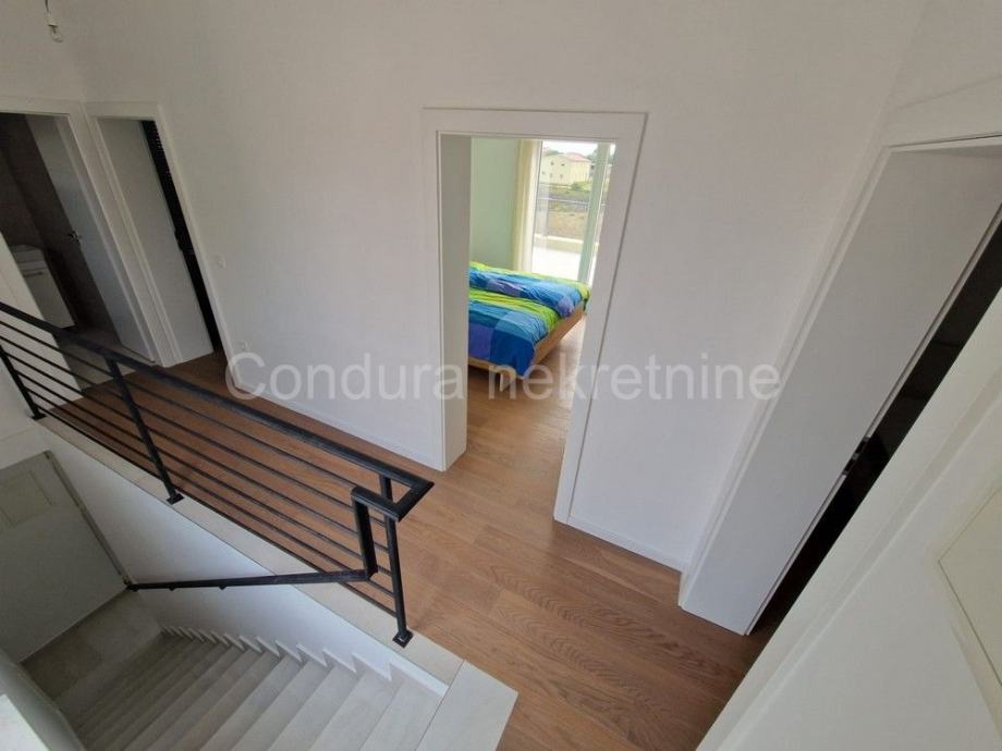 Raspored prostorija u prizemlju čine ulaz, WC, prostrani dnevni boravak s kuhinjom i blagovaonom, garaža te dvije djelomično natkrivene terase. Unutranjim stubištem se ide na gornju etažu gdje se nalaze hodnik, nenatkrivena terasa s pogledom na more, dvije spavaće sobe, kupaonica te glavna spavaća soba s vlastitom kupaonicom i izlazom na prostranu nenatkrivenu terasu s otvorenim pogledom na more i Velebit.