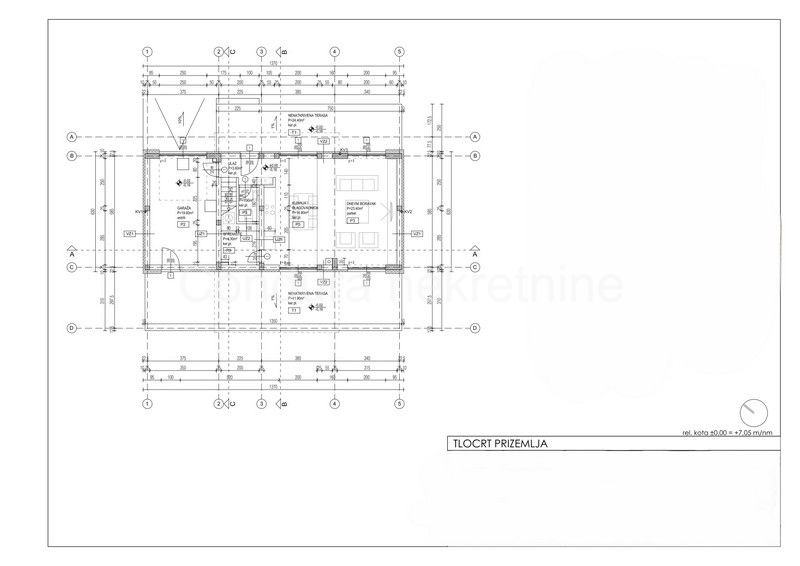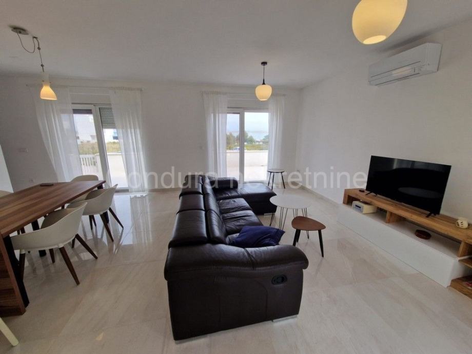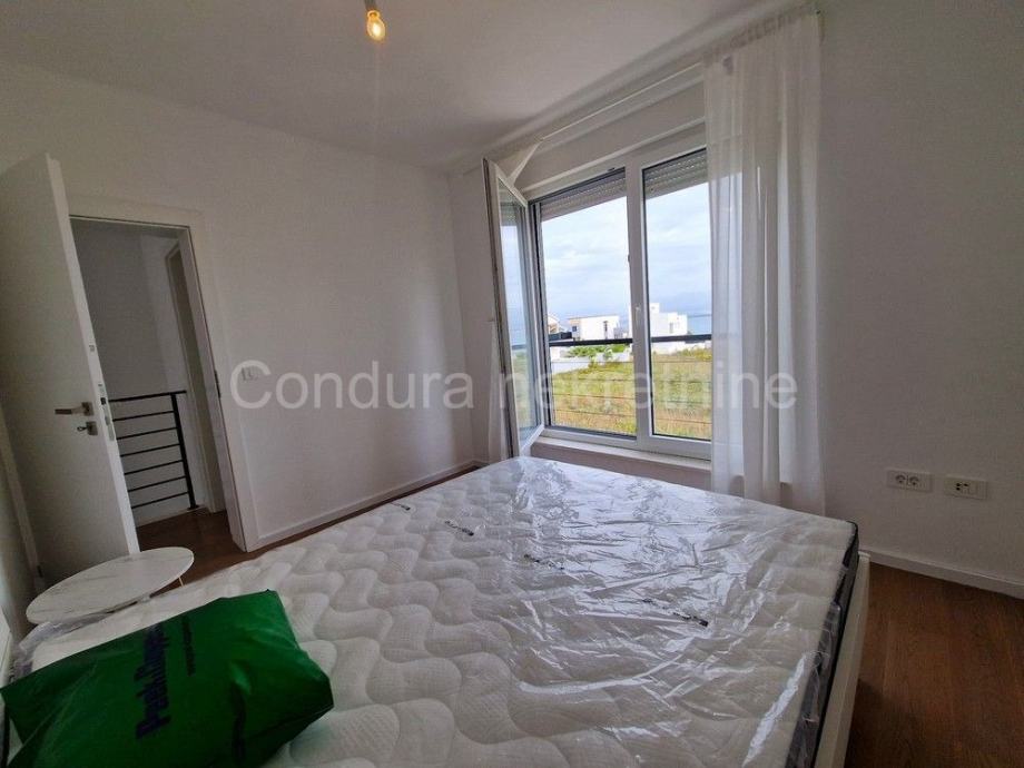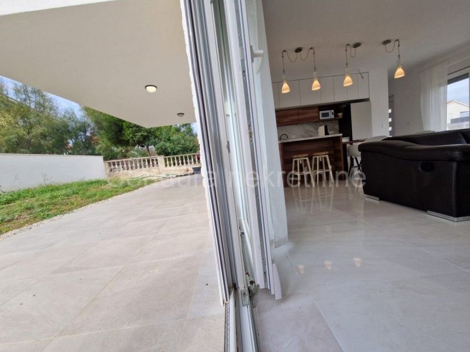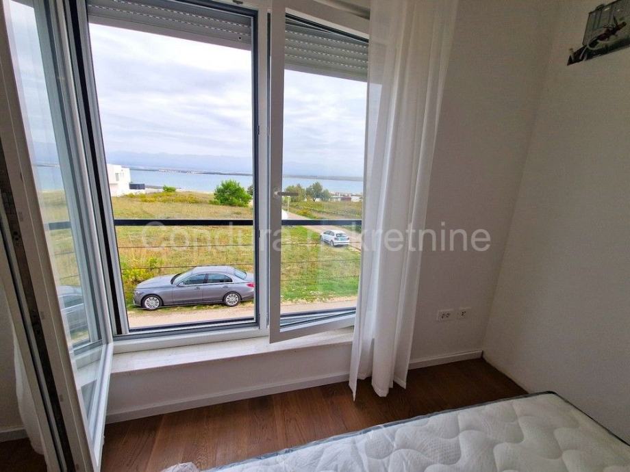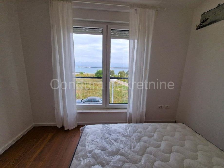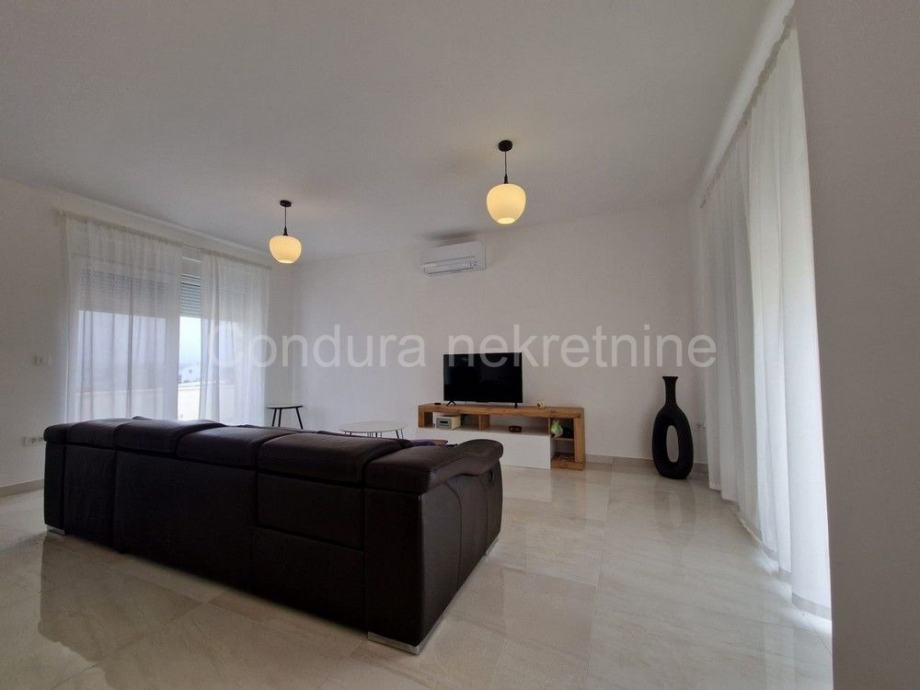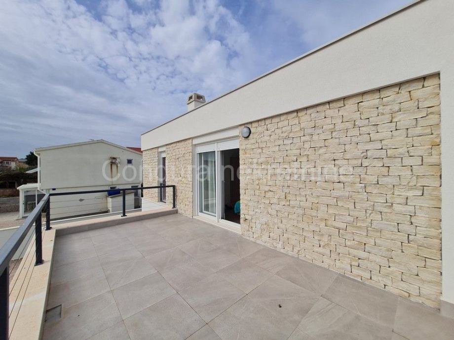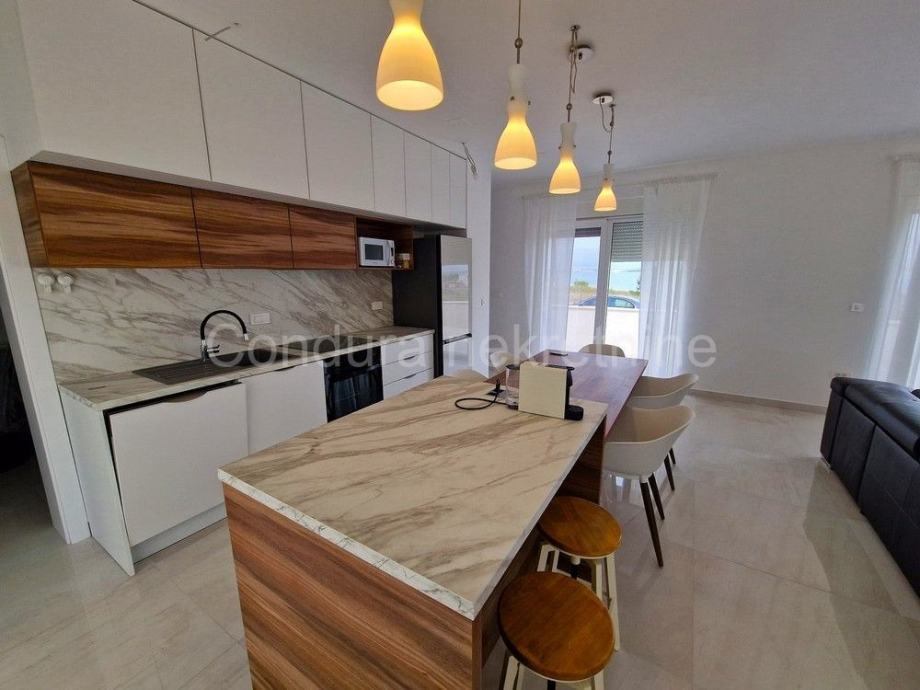 Raspored prostorija u prizemlju čine ulaz, WC, prostrani dnevni boravak s kuhinjom i blagovaonom, garaža te dvije djelomično natkrivene terase. Unutranjim stubištem se ide na gornju etažu gdje se nalaze hodnik, nenatkrivena terasa s pogledom na more, dvije spavaće sobe, kupaonica te glavna spavaća soba s vlastitom kupaonicom i izlazom na prostranu nenatkrivenu terasu s otvorenim pogledom na more i Velebit.