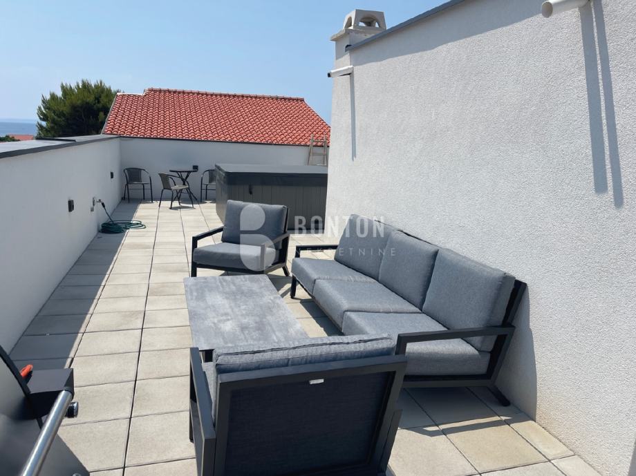 Apartman ima dvije spavaće sobe, potpuno opremljenu kuhinju i privatnu terasu od 4,45 četvornih metara. Premium sadržaji uključuju električno podno grijanje, rolete i mreže protiv komaraca te popločano parkirno mjesto. Na krovnoj terasi stanari mogu dijeliti jacuzzi, roštilj i sjedeću garnituru, što je savršeno mjesto za opuštanje i druženje. Također je idealan izbor za investitore, jer je potencijal najma do 200 eura/dan. Jedno parkirno mjesto ispred zgrade. Nekretnina je spojena na Struju, Vodu i Kanalizaciju.