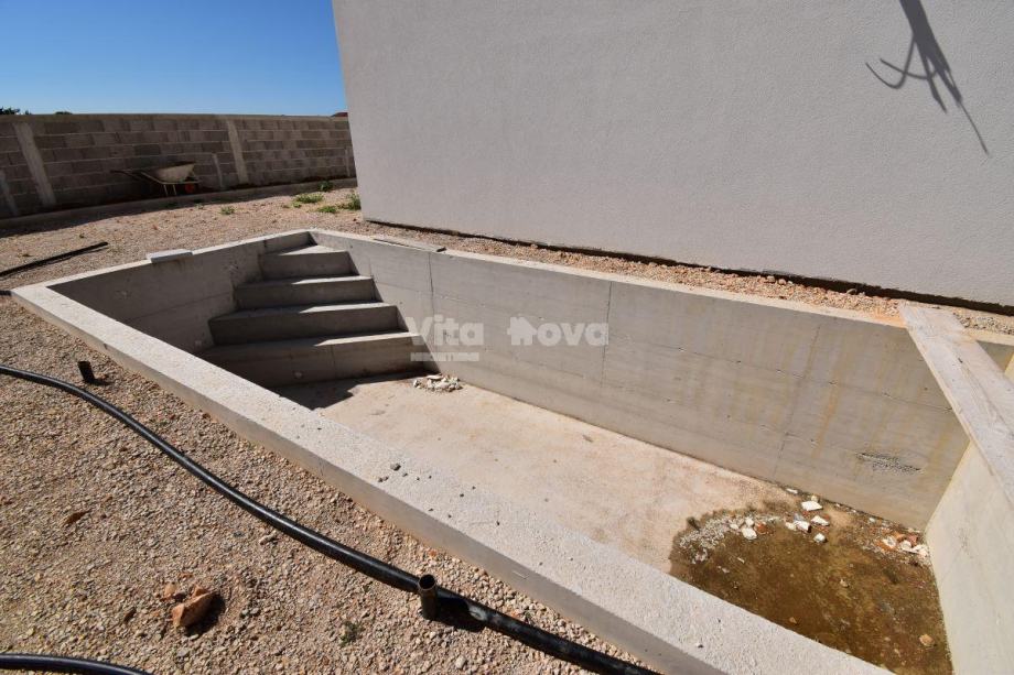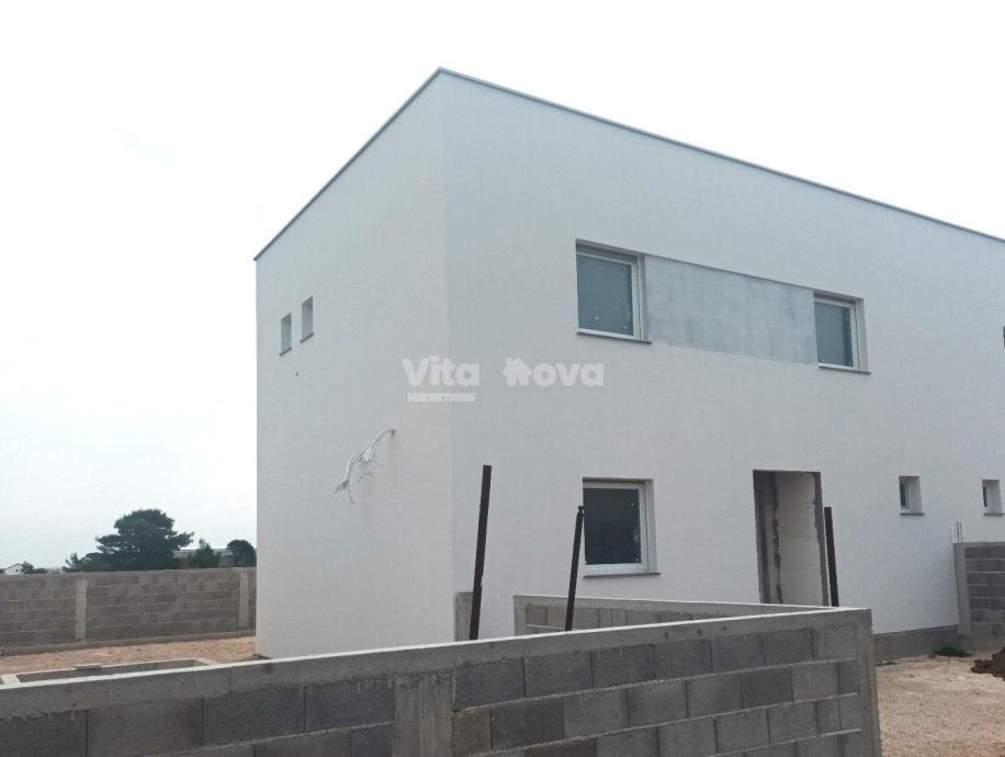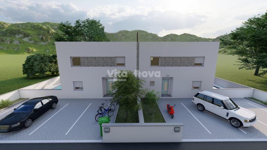Prilika! Prodaju se 2 kuće (dvojne), svaka sa svojim bazenom, novogradnja. Svaka kuća se sastoji od kuhinje, blagovaonice, dnevnog boravka, terase, kupaonice i spavaće sobe u prizemlju. Na katu svake kuće su još dvije spavaće sobe s kupaonicama, te praonica/ostava površine 8 m2 s potrebnim priključcima za perilicu i sušilicu rublja. Svaka kuća ima po 143 m2 stambenog prostora, te svakoj pripada po 206 m2 okućnice, a ispred kuća, zaklonjeni od pogleda, nalaziti će se bazeni. Ispred ulaza u kuće su predviđena parkirna mjesta.