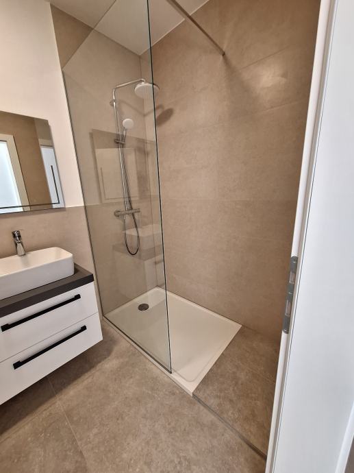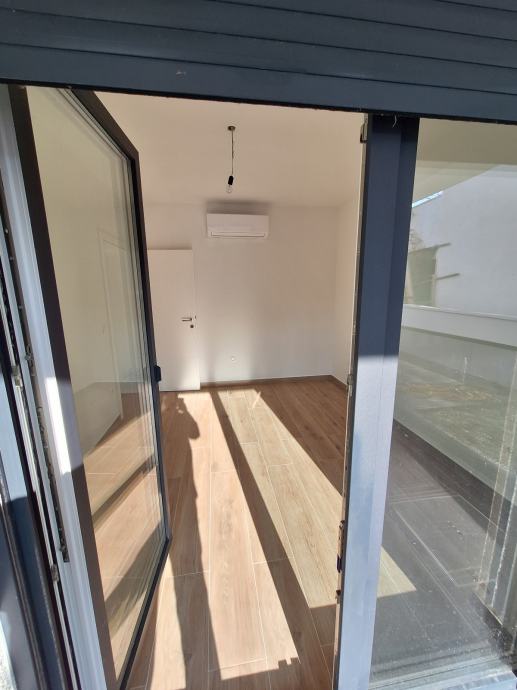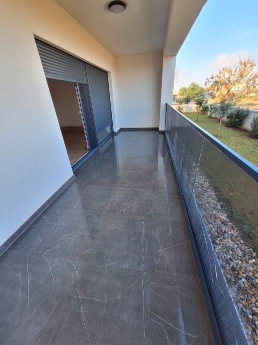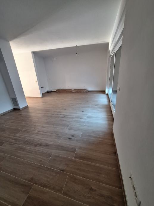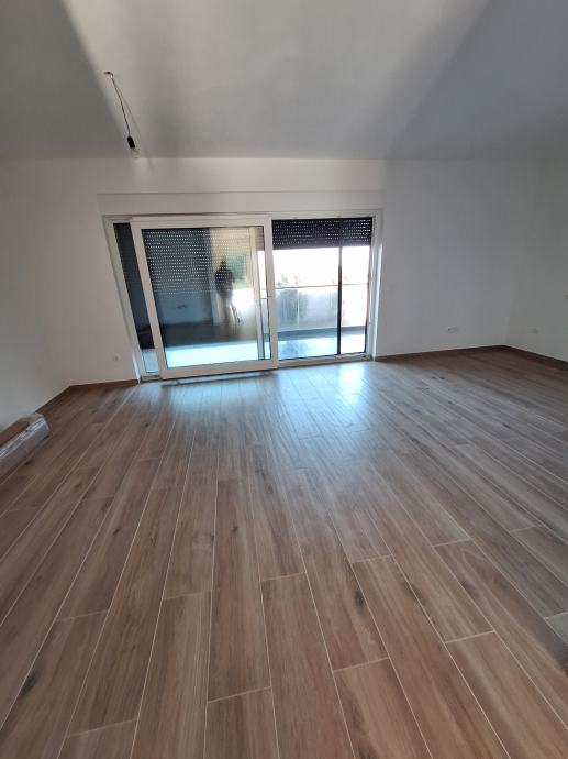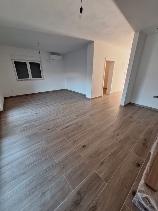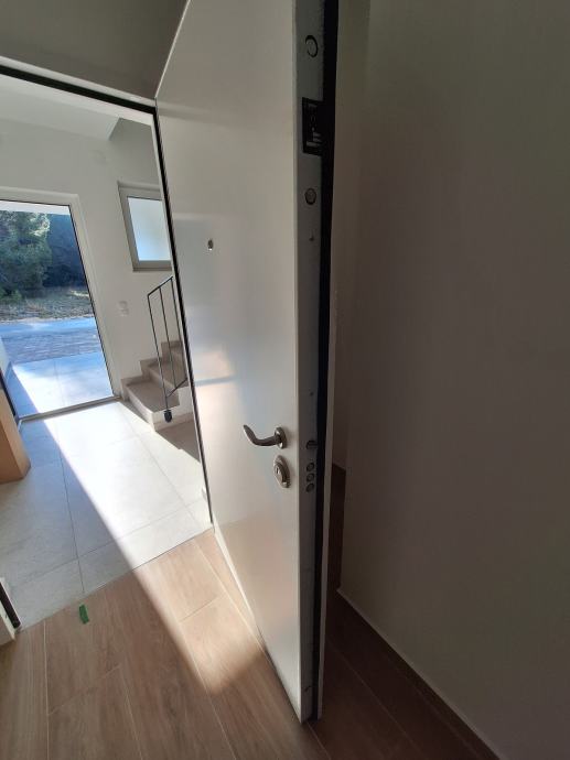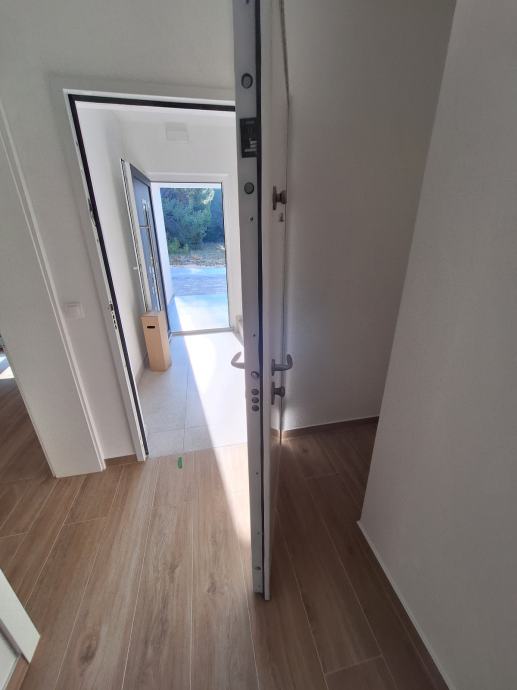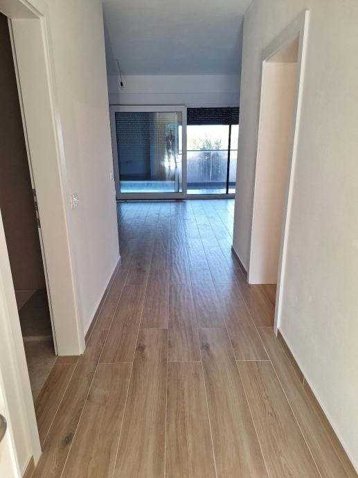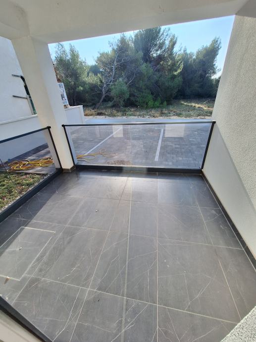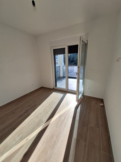 Dvosobni etazirani apartnan prizemlje sastoji se od kuhinja blagavonica dnevni boravak open space princip iz kojih se izlazu na veliku prostranu terasu s otvorenim pogledom na more, dvije spavaće sobe od kojih jedna ima prostranu terasu, kupatilo. Okućnica dužinom cijelog stna i dio ispred prostrane terase pripada stanu. Moguće napraviti pergolu i grill ispred terase na koju se izlazi iz dnevnog boravka. Vlasnik je uredio dvoriste i ostavio kupcima na volju da urede po svom izboru. Po projektu je uređeni vrt za sunčanje. Okučnica koja pripada stanu upisana je u etažni elaborat i zk izvadak.
