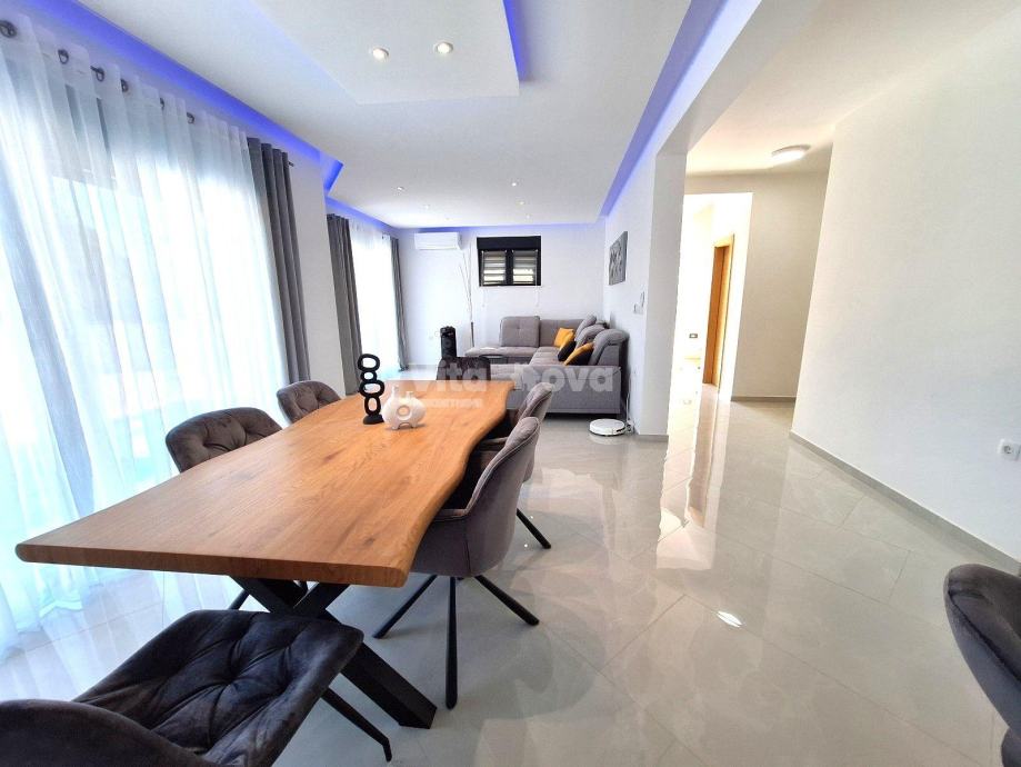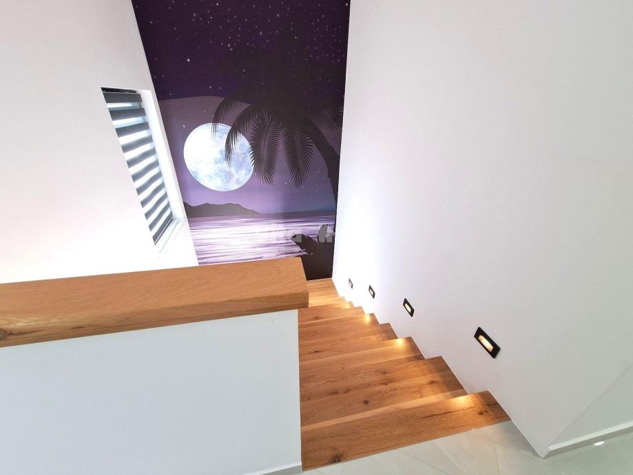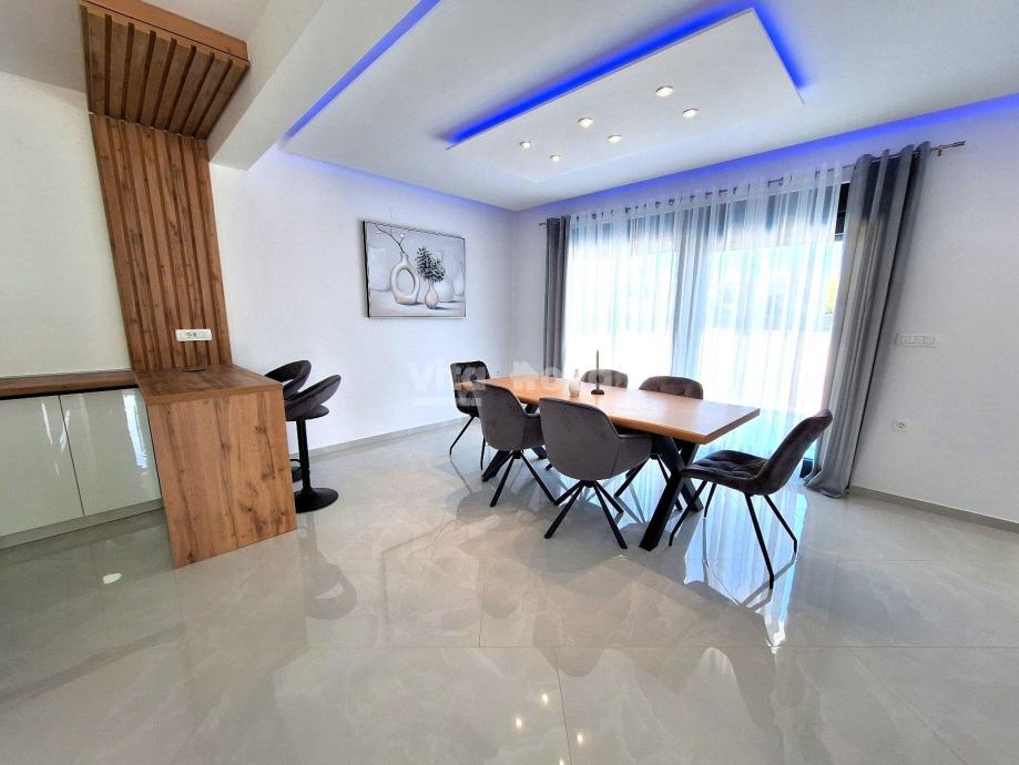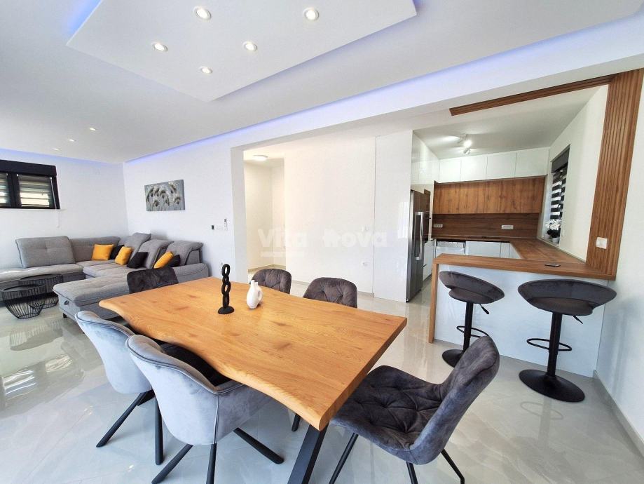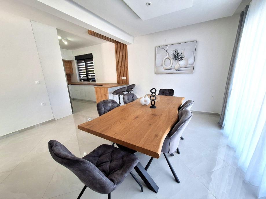 Prizemlje: Prostrana kuhinja, blagovaonica i dnevni boravak u open space konceptu, spremište, praonica, terasa s izlazom na bazen.