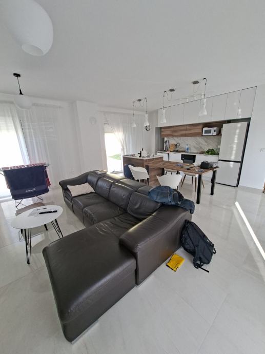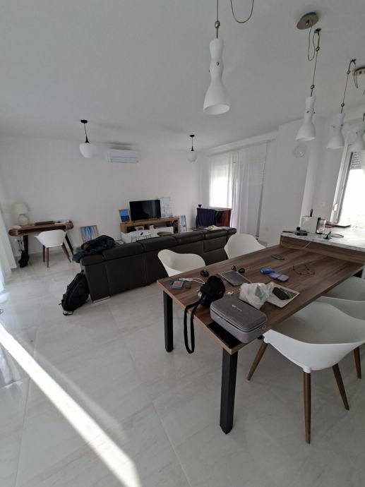 Pr. Open space prostor kuhinja blagavaonica dnevni boravak i toalet. Iz djela hidnika izlazi su u garažu,a na drugoj strani je izlaz na terasu i vrt kuće odakle se pruža otvoren pogled na more taj dio predviđen je sa sunčanje i vrt.