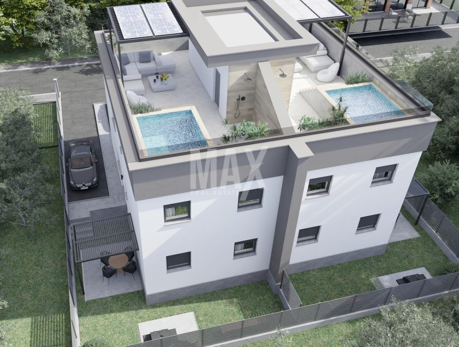 Stanu 3 pripadaju 2 parkirna mjesta od 12,50 m2 ( ukupno 25 m2 ) i dvorište 14,14 m2 označeno crvenom bojom, te terasa na katu ( ravni krov s pristupom ) cca 60 m2 .