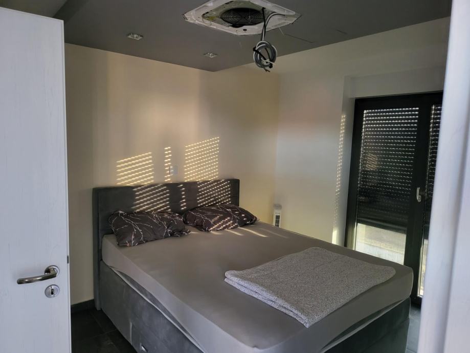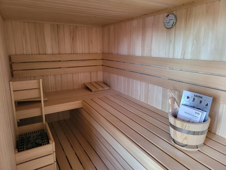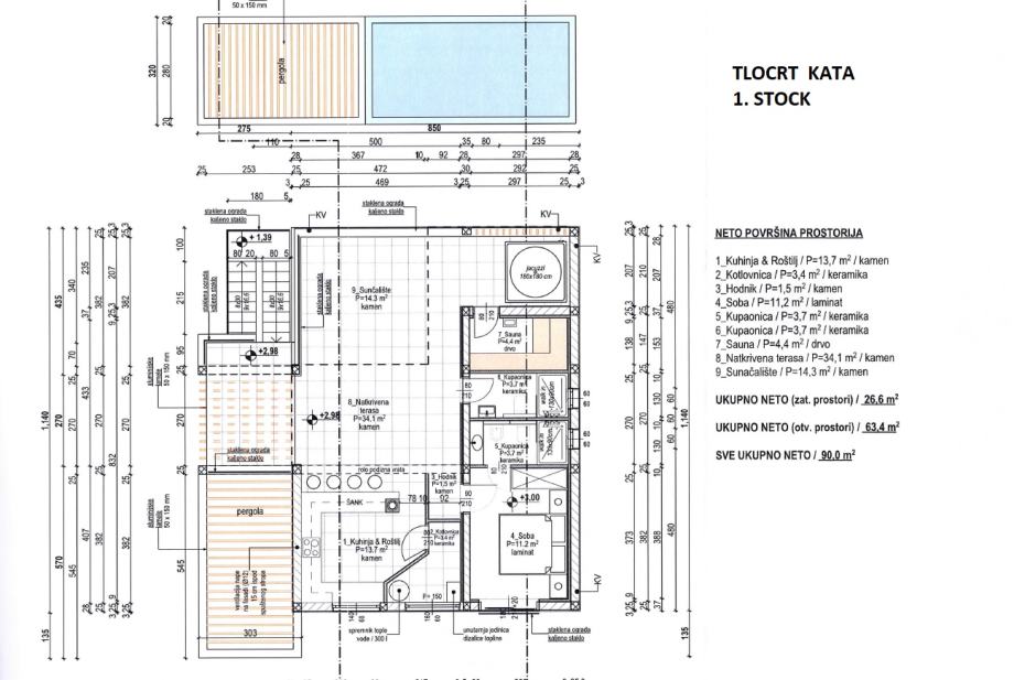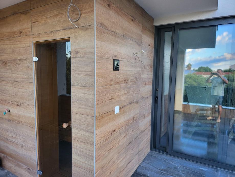 - na katu kuće su spavaća soba, dvije kupaonice, sauna, jacuzzi, kuhinja sa roštiljem, natkrivena terasa, sunčalište i kotlovnica,