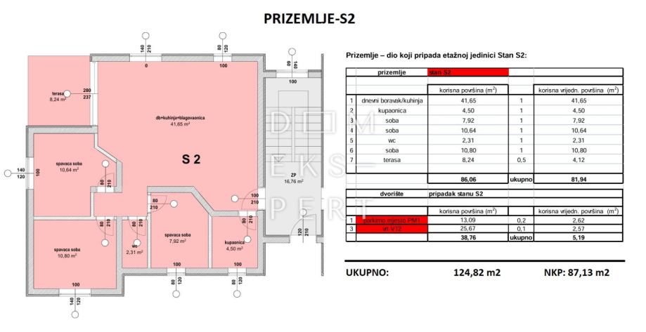 Svi pripatci se obračunavaju po zakonskim koeficijentima, a neto korisna površina stana sa svim pripatcima iznosi 87,13 m2.