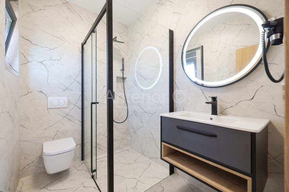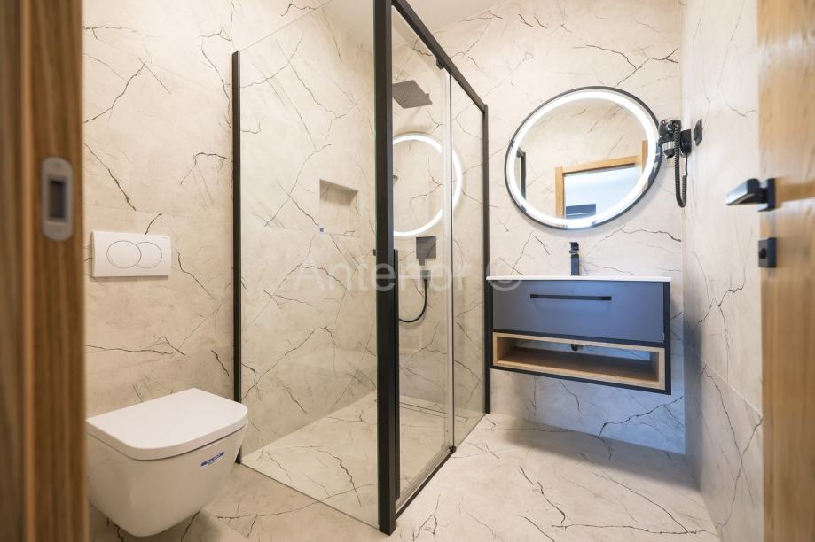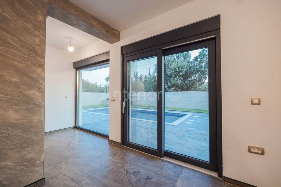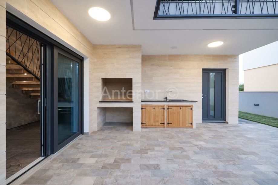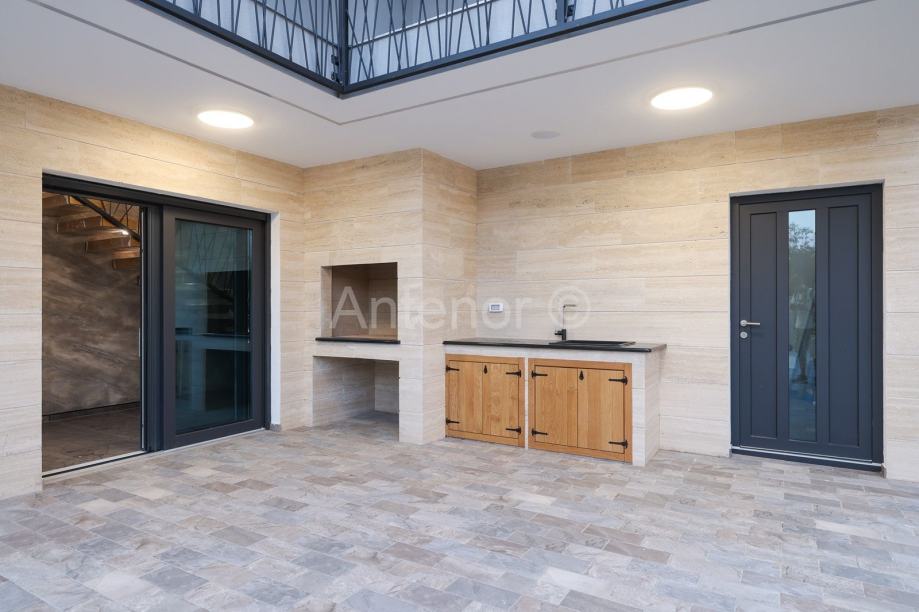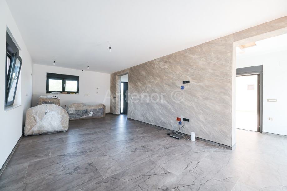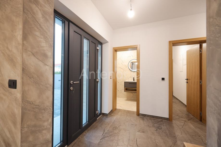 Kuća je opremljena sa klima uređajima, podnim grijanjem i video nadzorom, te uređenim priključkom za cisternu za vodu, elektro mrežu i septičku jamu.