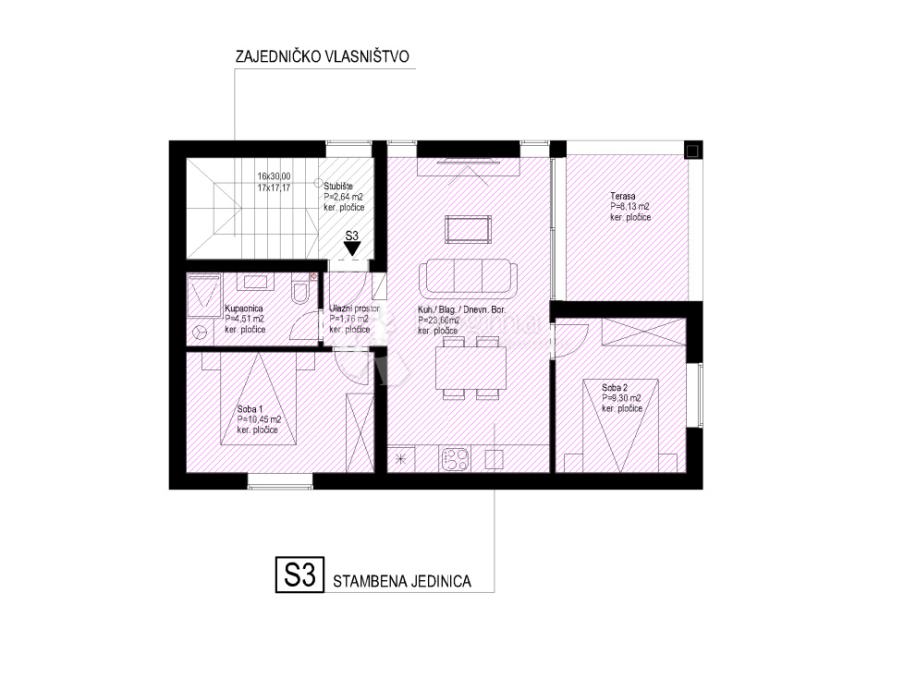 U ponudi je stan S3, smješten na drugom katu manje stambene zgrade s ukupno tri stambene jedinice. Stan je dvosoban, opremljen s tri klima uređaja, a kupaonica ima podno grijanje. Uz stan dolaze dva parkirna mjesta, a dodatna posebnost ovog stana je pogled na more.