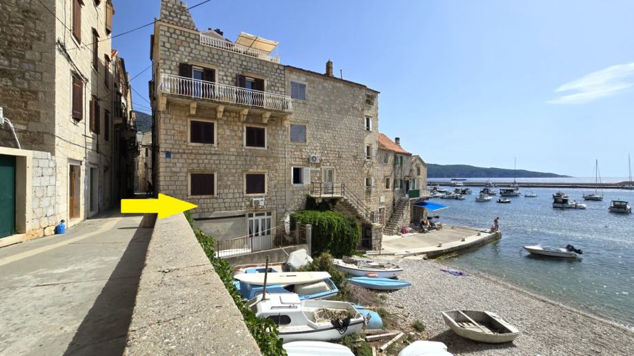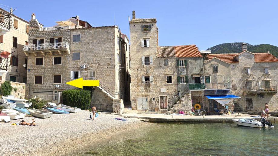 Dvoetažni dvosobni komforni stan ukupne površine 45,68 m2, smješten u kamenoj kući direktno na šljunčanoj plaži u Komiži na otoku Visu, prizemlje i 1. kat, sa ulazom s Ribarske ulice i s plaže, betonske međukatne konstrukcije, sa ograđenim dvorom ispred, površine cca 20 m2, kojim se koristi isključivo ovaj stan, pogled na more i plažu, u blizini svih sadržaja, rijetko na tržištu.