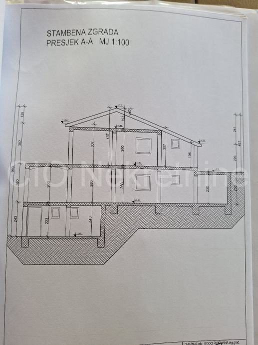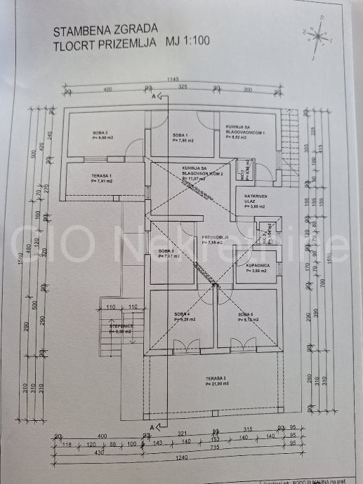 PRIZEMLJE 98,37: natkriven ulaz, 2 kuhinje sa blagovaonicom, 5 spavaćih soba, predsoblje, kupainica 2 terase, stepenice i 2 wc-a.