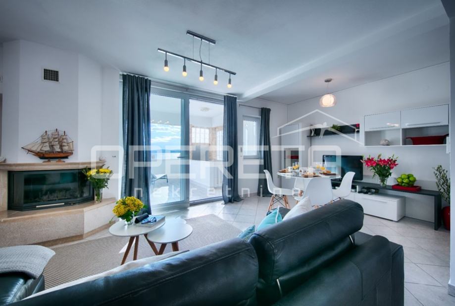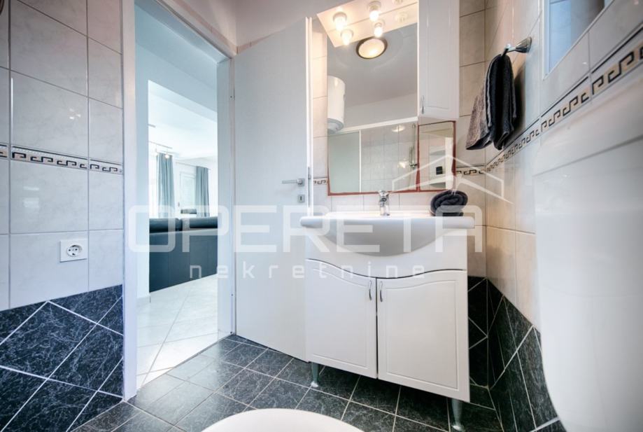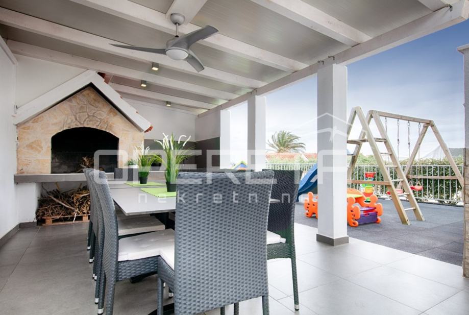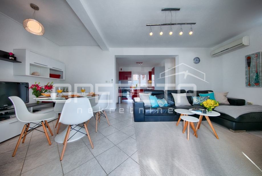 U prizemlju urbane vile ,koja se nalazi u neposrednoj blizini mora u Visu, prodaje se stan površine 60m2. Stan se sastoji od dnevnog boravka s kuhinjom i blagovaonicom, dvije spavaće sobe i kupaonice. Stan ima izlaz na natkrivenu terasu od 15 m2 ispod koje se nalazi dječje igralište i pripada mu vrt od 90 m2 sa roštiljem i solarnim tušem. Uz stan dolazi i jedno parkirno mjesto.