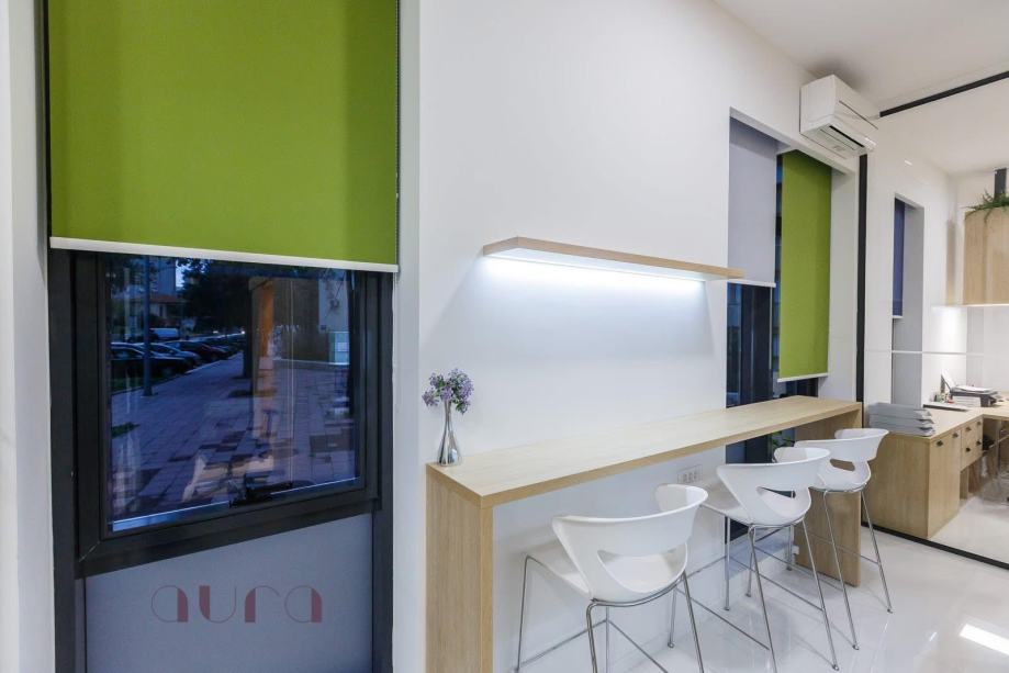 It is fully equipped and functionally divided into several zones: a central service core with an info desk, offices for employees, an office for the director and a meeting room. A total of 5 independent offices, a kitchen, and two toilets. The furniture is made of natural materials with extremely warm and bright colors, and the dynamics of different ambiance for day and night work are achieved. The "open office" is achieved in a visual sense with large glass surfaces and high ceilings.