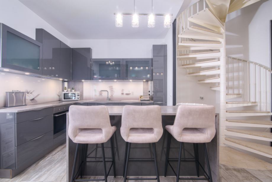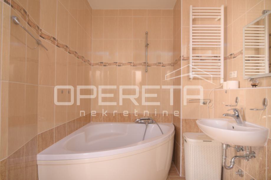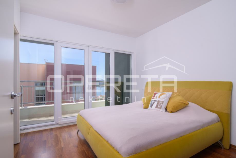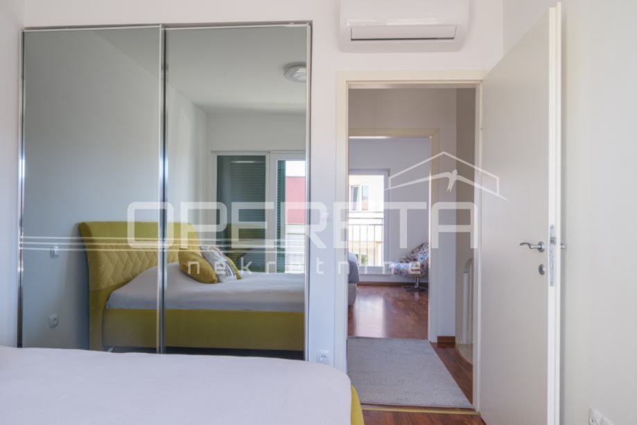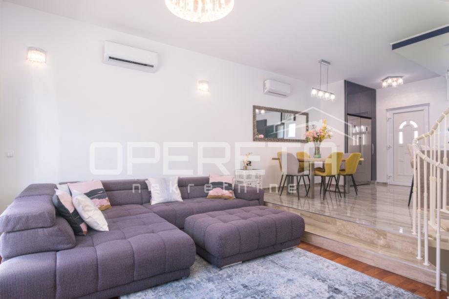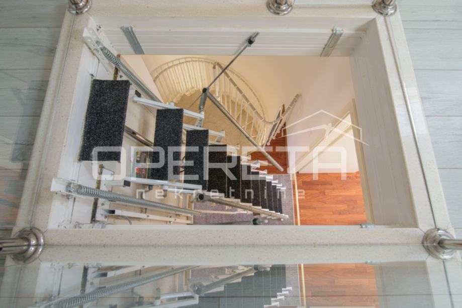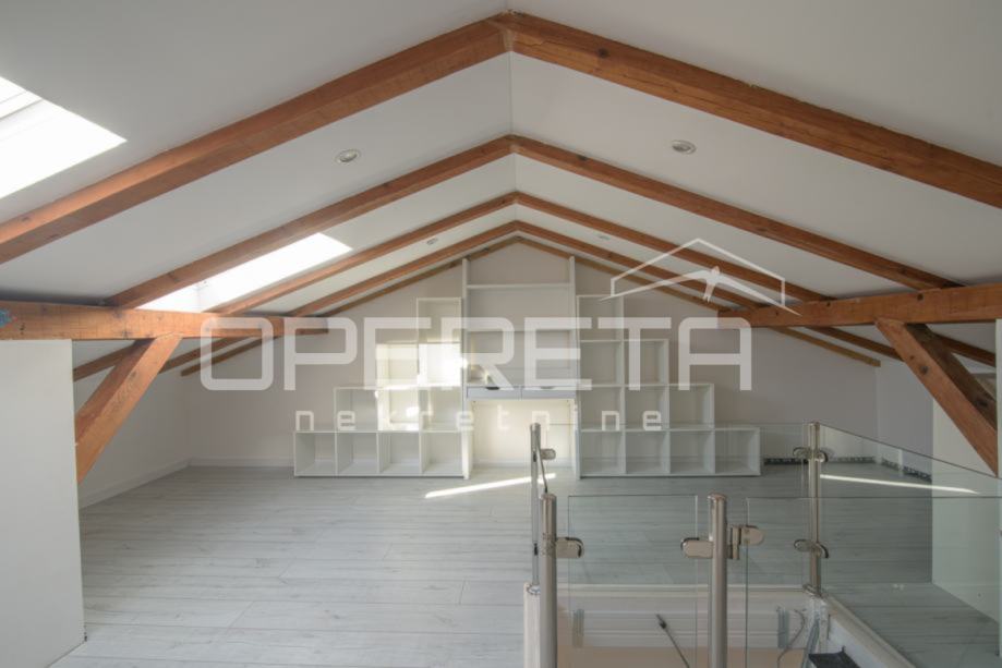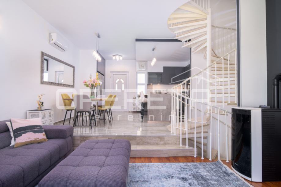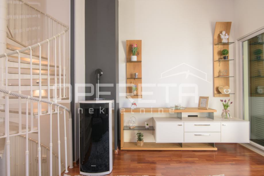Prostor je organiziran kroz više razina koje povezuje elegantno spiralno stubište, dok se u dodatno iskorišteno potkrovlje ulazi električnim padajućim stubištem na daljinsko upravljanje. U prizemlju se nalaze garaža od 20,24 m² s velikim ugradbenim ormarom, praonica s lavandinom i solarnim bojlerom te praktičan toalet za goste. Prva etaža oblikovana je kao dnevna zona otvorenog koncepta s kuhinjom, blagovaonicom i dnevnim boravkom; nekoliko blagih razina unosi dinamiku prostora, visoki stropovi i velike staklene stijene pojačavaju dojam prozračnosti, a izlaz na lođu nudi djelomičan pogled na more. Na drugoj etaži smještene su dvije spavaće sobe, svaka s vlastitom kupaonicom i ugradbenim ormarom; zapadno orijentirana soba ima i vlastiti balkon s najljepšim pogledom iz stana. Potkrovlje je prenamijenjeno u koristan stambeni dio s približno 20 m² pune visine te dodatnih 20 m² niskog prostora, što se može iskoristiti kao dječja zona, radni ili hobi prostor.