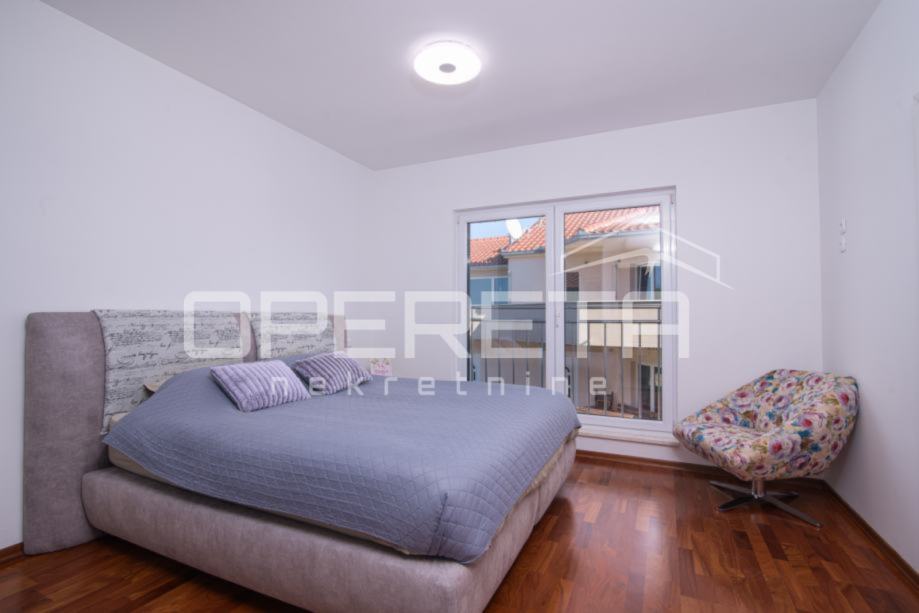 U mirnoj ulici Okruga Gornjeg, na nekoliko minuta hoda do plaže i svakodnevnih sadržaja, nalazi se vrlo svijetao i prostran trosobni stan od 123 m² u manjoj zgradi jedinstvenog koncepta. Objekt je vertikalno podijeljen na tri stana pa svaki vlasnik ima osjećaj privatnosti i mir kakav se u pravilu vezuje uz život u kući. Ovaj stan zauzima središnji dio zgrade, što donosi najbolju toplinsku zaštitu i ugodnu mikroklimu kroz cijelu godinu. Prednost su i dva neovisna ulaza: glavni na prvom katu te izravan pristup iz vlastite unutarnje garaže u prizemlju.