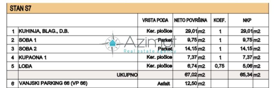 Stan S7 nalazi se u prizemlju stambene zgrade. Ima 2 sobe, kupaonu, kuhinju, blagovaonicu, dnevni boravak i lođu, a ukupna površina stana je 65,34 m2..Vanjski parking sadrzi 12,50m2. Zgrada se upravo zavrsava i privodi kraju. Ova prekrasna zgrada se nalazi od strogog centra umaga svega 5min pjeske.