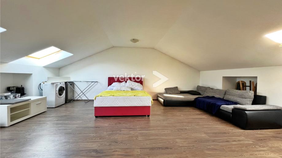 Visoko potkrovlje površine 44,62 m² trenutno je otvoreni prostor s krovnim prozorima. Postavljene su instalacije za kupaonicu, pa postoji mogućnost uređenja u studio apartman, dodatnu spavaću sobu ili prostor za rekreaciju, igru ili hobi.