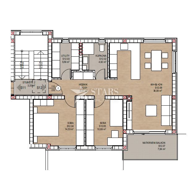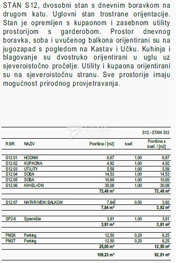 Stan S12 je dvosobni stan s dnevnim boravkom, smješten na drugom katu, trostrane orijentacije.