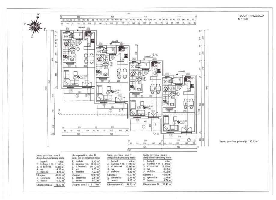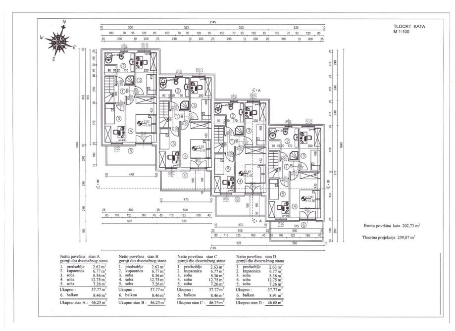 Ukupno: 77,84 m2 + 11,66 m2 terasa i spremište + balkon 8,46 m2 = 97,96 m2.