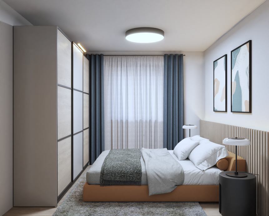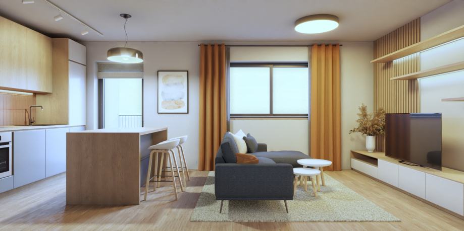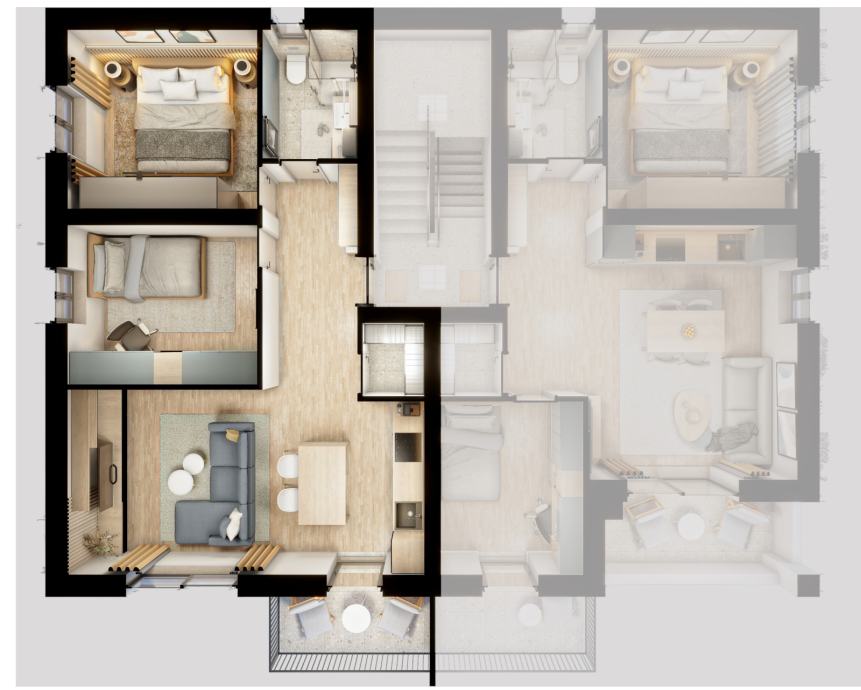 Jedan od dostupnih stanova: 2SB + DB (desni) 1 kat — sastoji se od dnevnog boravka s kuhinjom, dvije spavaće sobe, kupaonice, balkona. Stanu pripada jedno parkirno mjesto, a kupac postaje suvlasnik posebnog dijela nekretnine i pripadajuće parcele.