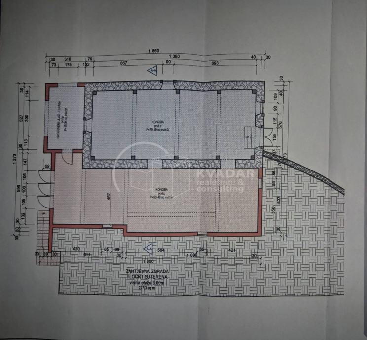 Podrumski prostor ima izlaze na tri strane, te je podijeljen u dva dijela. Sa zapadne strane je pripadajuća terasa.