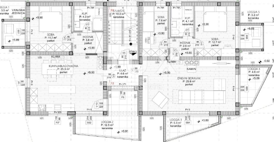Stan se nalazi na trećoj etaži i obuhvaća hodnik, moderno koncipiranu kuhinju s blagovaonicom, prostrani dnevni boravak, tri udobne spavaće sobe, dvije kupaonice i čak pet loggia koje pružaju predivan pogled na Kastav i prirodu. Uz stan dolazi i pripadajući dio okućnice.