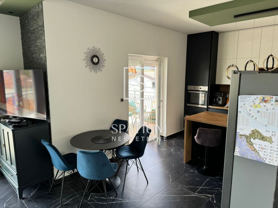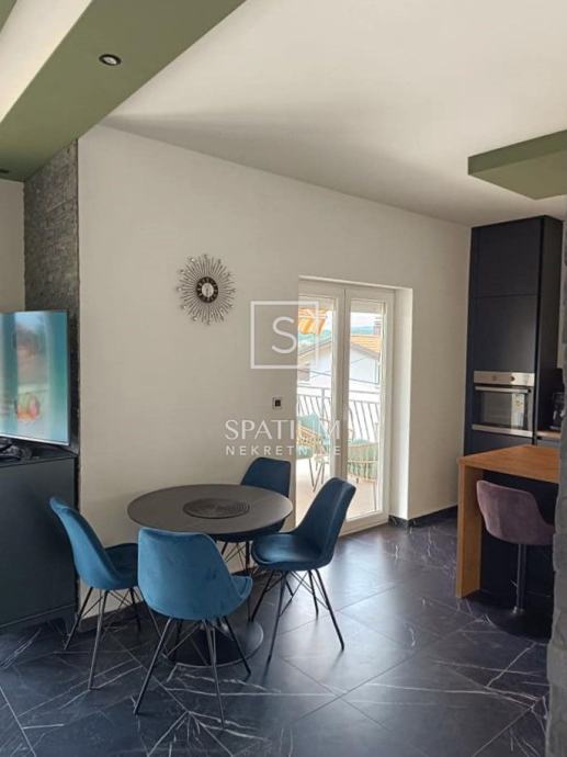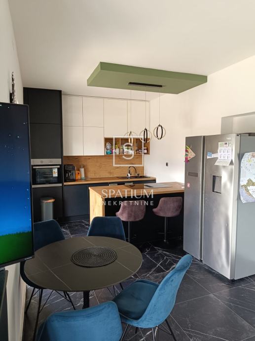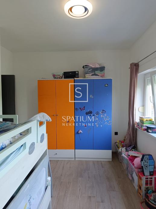 Na prvom katu je trosobni stan s dnevnim boravkom i kuhinjom s blagovaonicom u jednom otvorenom prostoru, koji ima izlaz na veliku terasu s koje se pruža prekrasan otvoreni pogled na Viškovo, Kastav i prirodu.