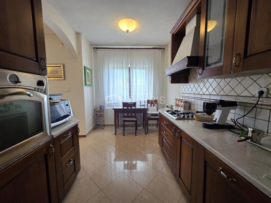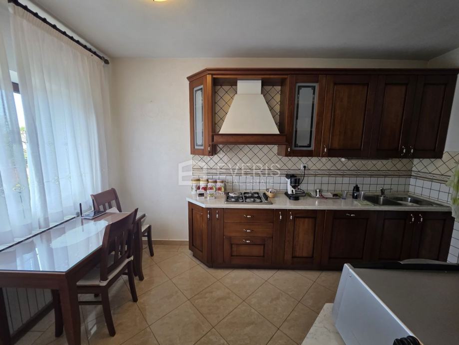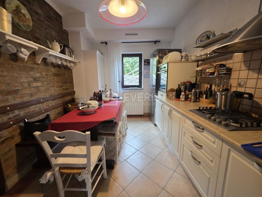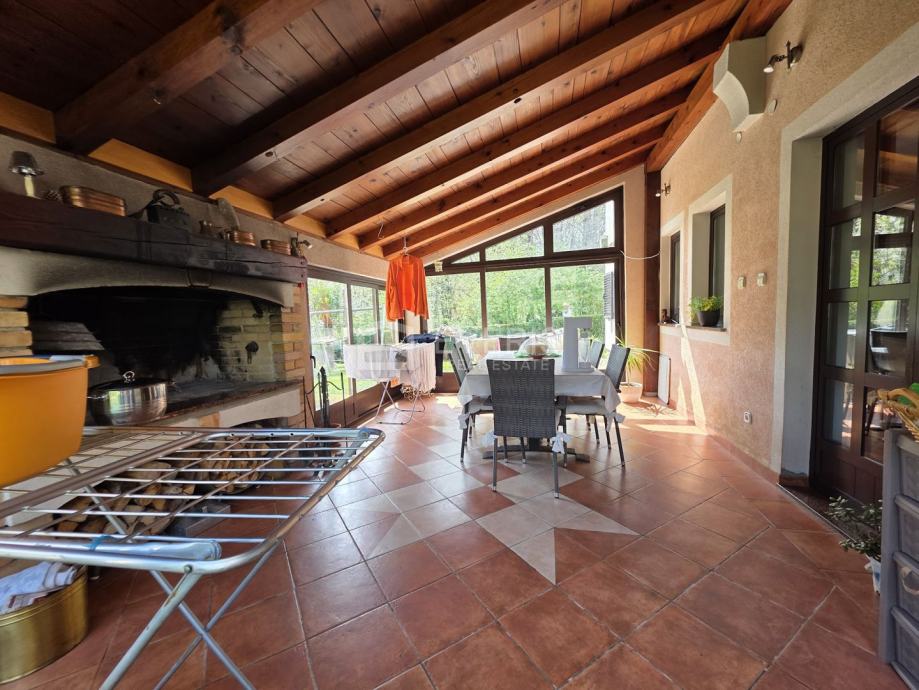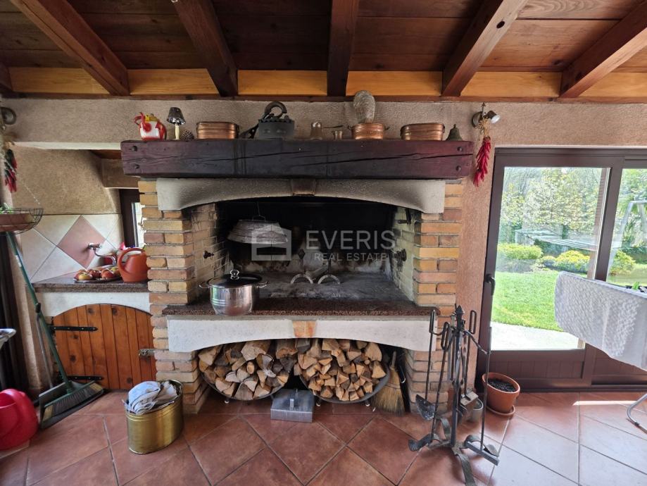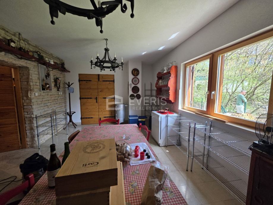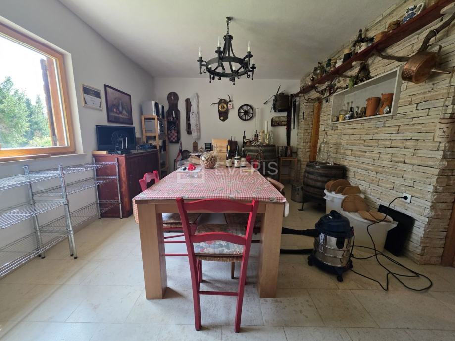 ▪ Prizemlje površine cca 90 m2: stan koji se sastoji od hodnika, dnevnog boravka, kupaone, veće ostave / sobe, kuhinje s blagovaonom, a na izlazu iz blagovaone je natkriveni prostor /veranda s vanjskom kuhinjom i velikim kaminom.